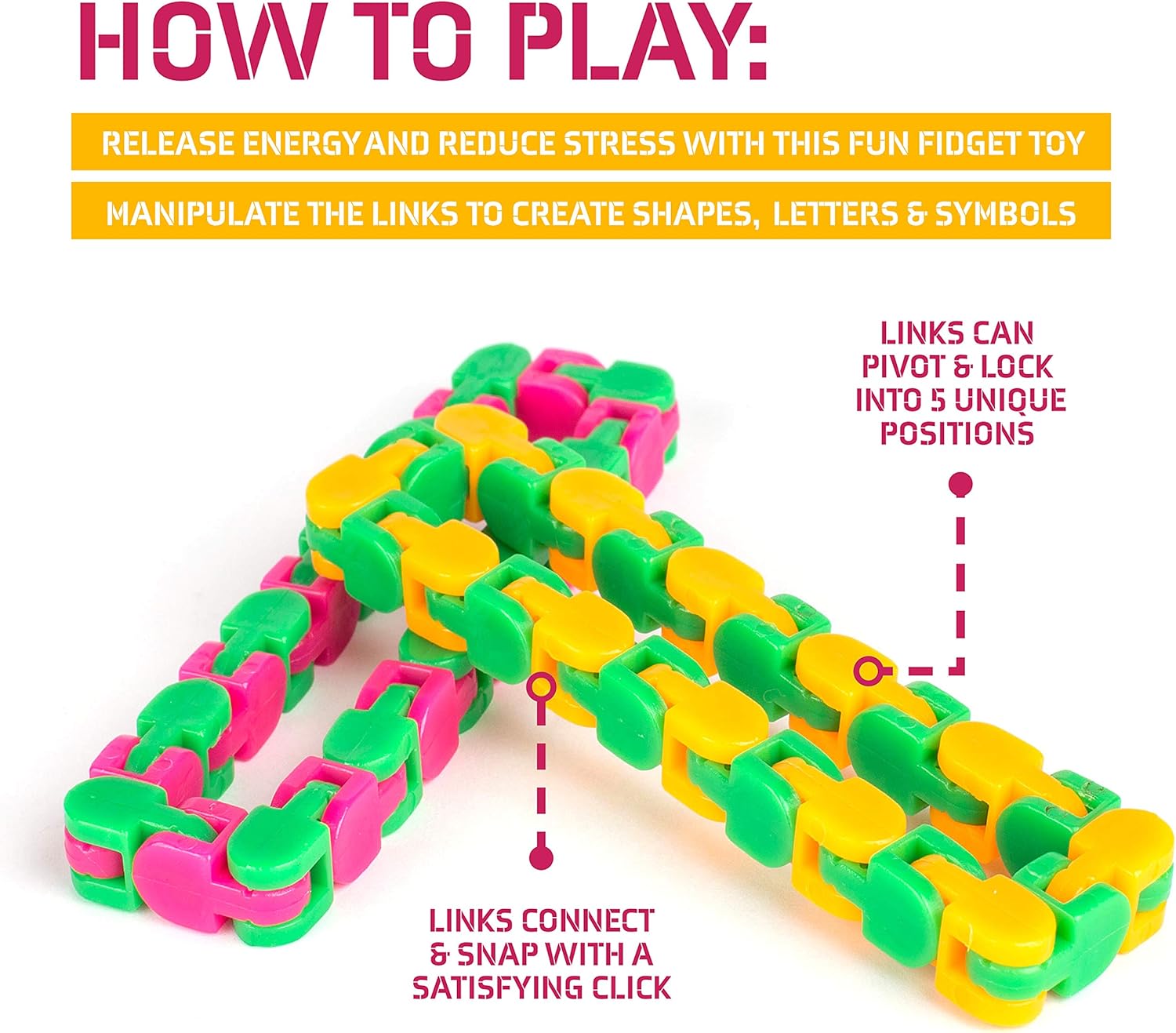 - SNAP AND CLICK! Each of the 24 links on the Snap & Click Toy pivots and locks into 5 positions so you can build and shape the chain in lots of different ways. When you snap the links together, they emit a satisfying CLICK sound.