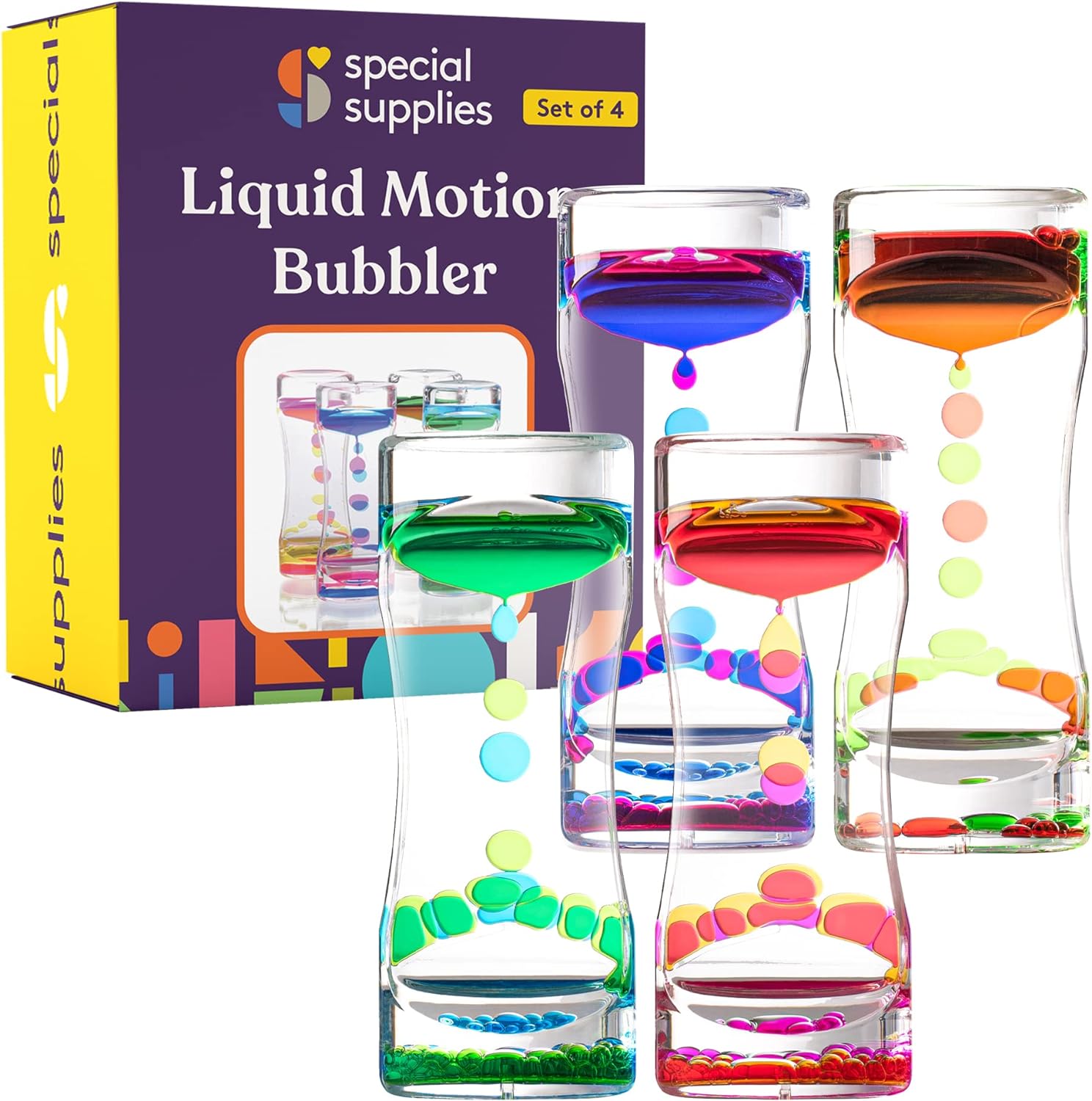 Special Supplies Liquid Motion Bubbler Toy (4-Pack) Colorful Hourglass Timer with Droplet Movement, Bedroom, Kitchen, Bathroom Sensory Play, Cool Home or Desk Decor