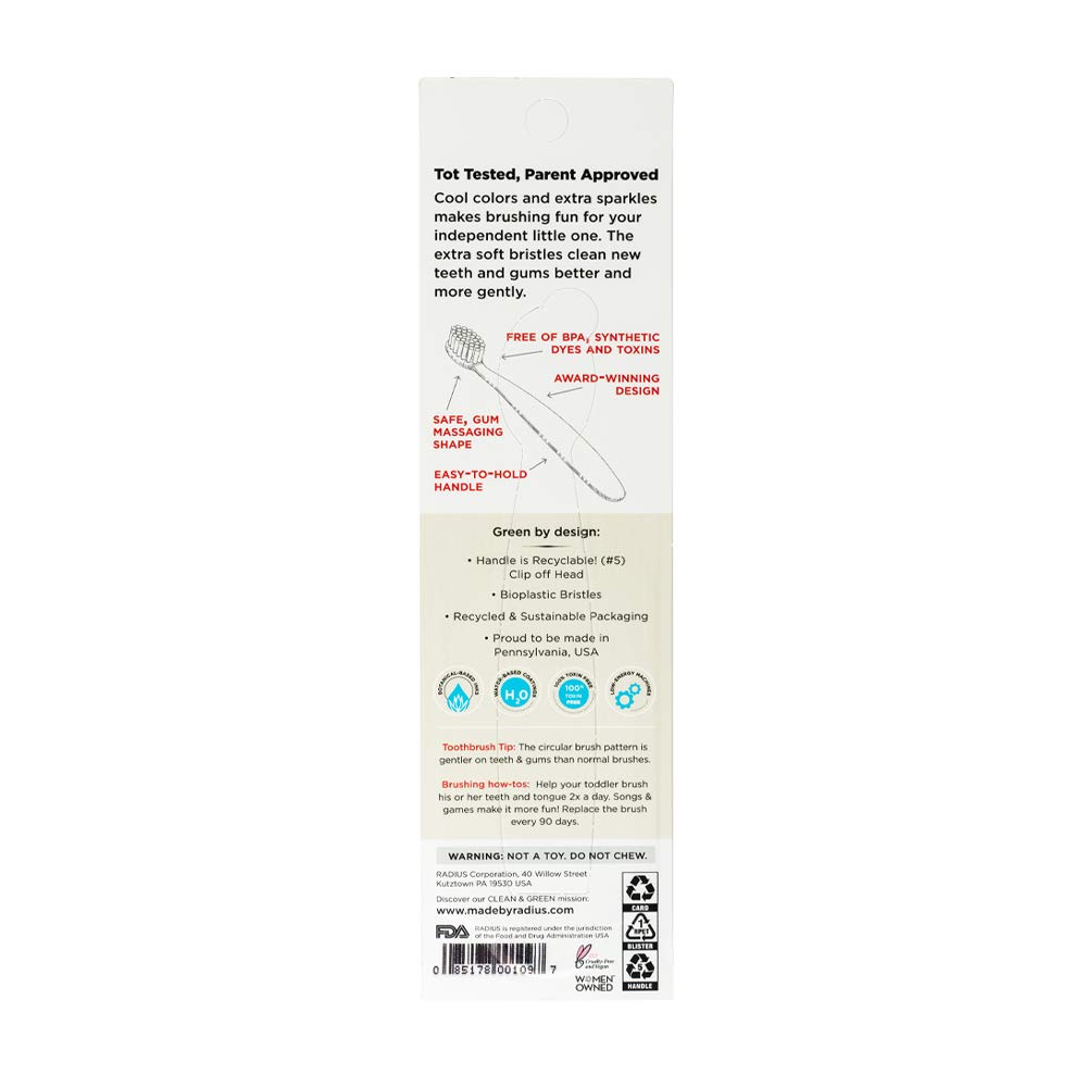 RADIUS Toddler Toothbrush and Toothpaste Bundle for Kids, 2 Pack Totz Extra Soft Brush in Pink and Purple Sparkle and 1 Count Dragon Fruit Toothpaste, for Children 18 Months and Up