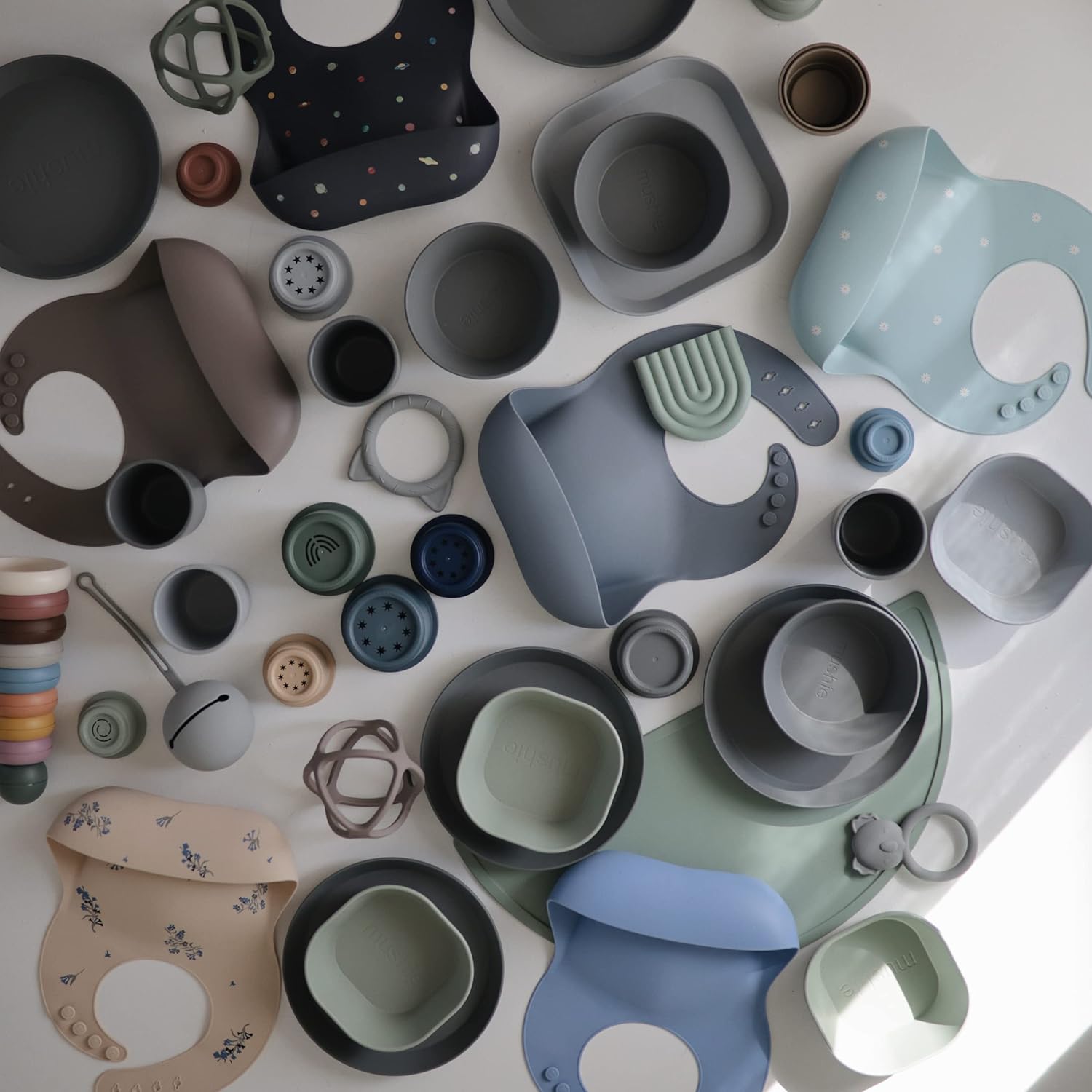 - Keep your little one feeling comfy and clean with our fun-loving collection of silicone bibs. Designed in Sweden, mushie bibs feature classic patterns capturing a look that's both timeless and elegant. Our timeless colors and patterns pair well with mushie silicone placemats, splat mats and tableware.