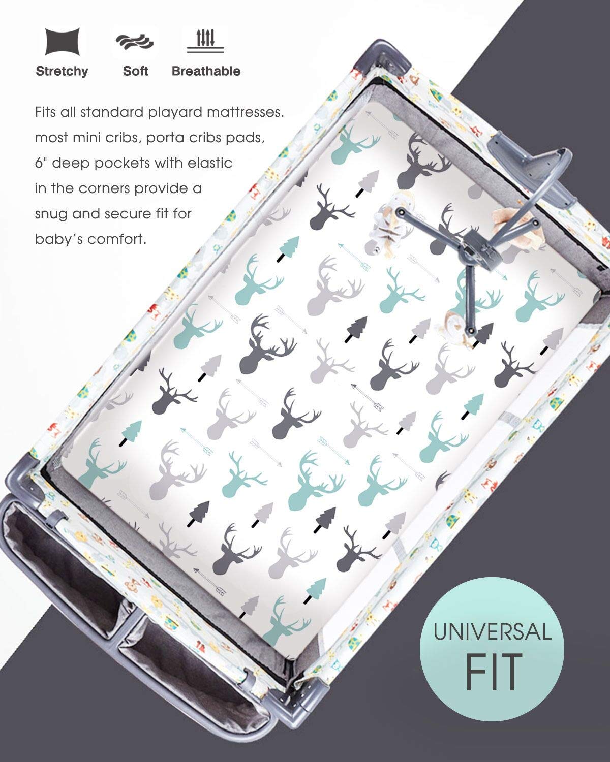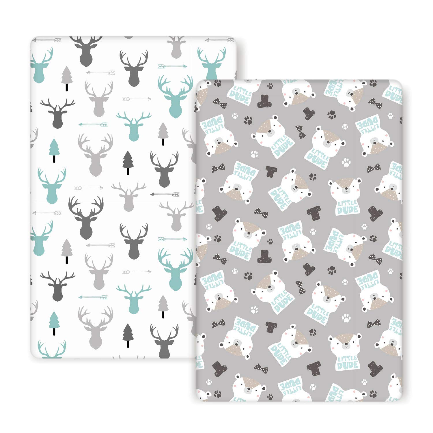 GRSSDER Stretchy Ultra Soft Jersey Knit Fitted Pack n Play Sheets 2 Pack, Playard Sheets for Baby Girls and Boys, Universal Fit for Pack N Plays Safe and Snug, Cute Bear and Deer