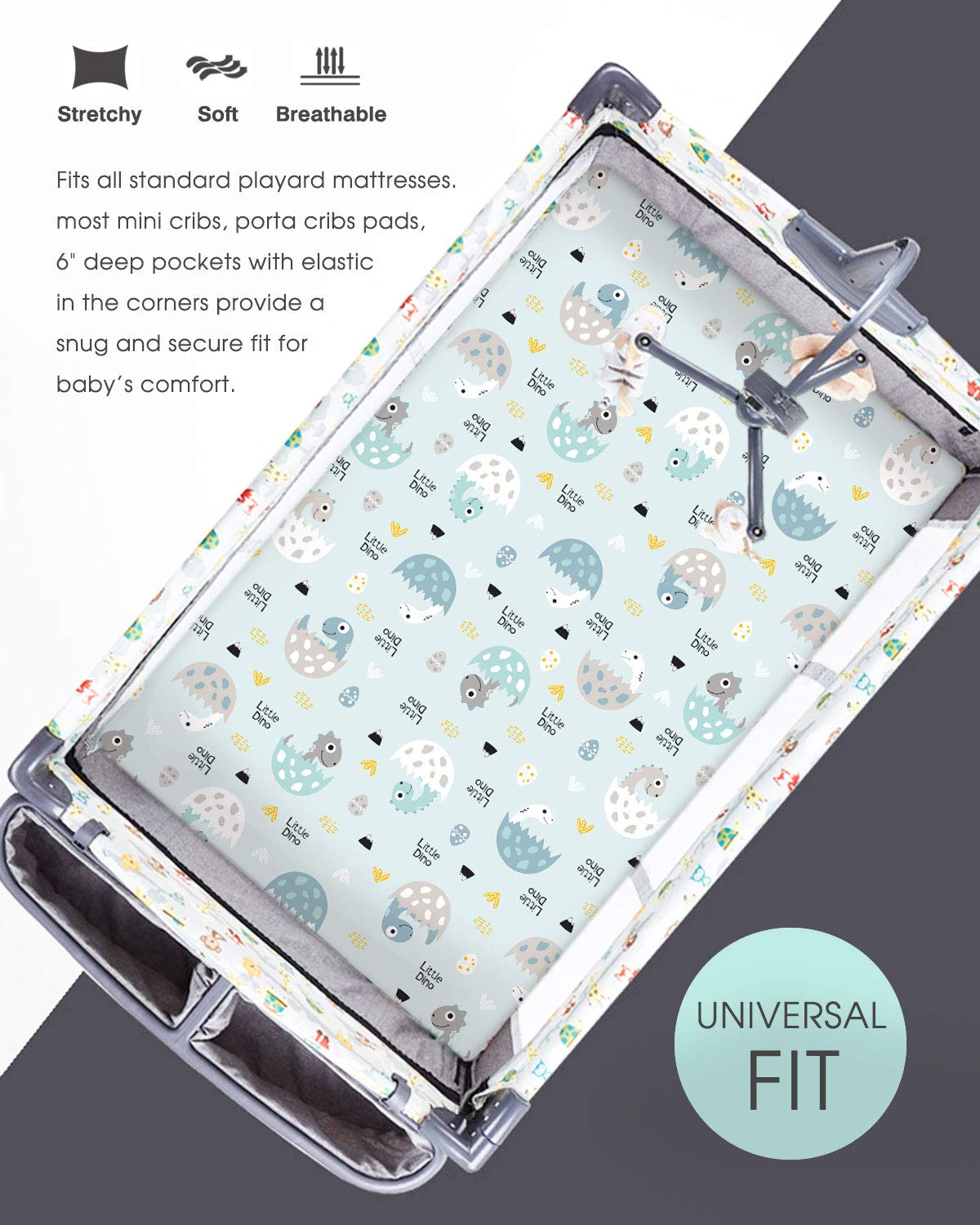 - Apple It Within Seconds: Thanks to the elastic bottom, our pack n play sheets come in a classic, cute dinosaurs and dinosaur eggs pattern that will put the finishing touches to any bedding. Make sure to give your darling a serene and calm bed to rest in.