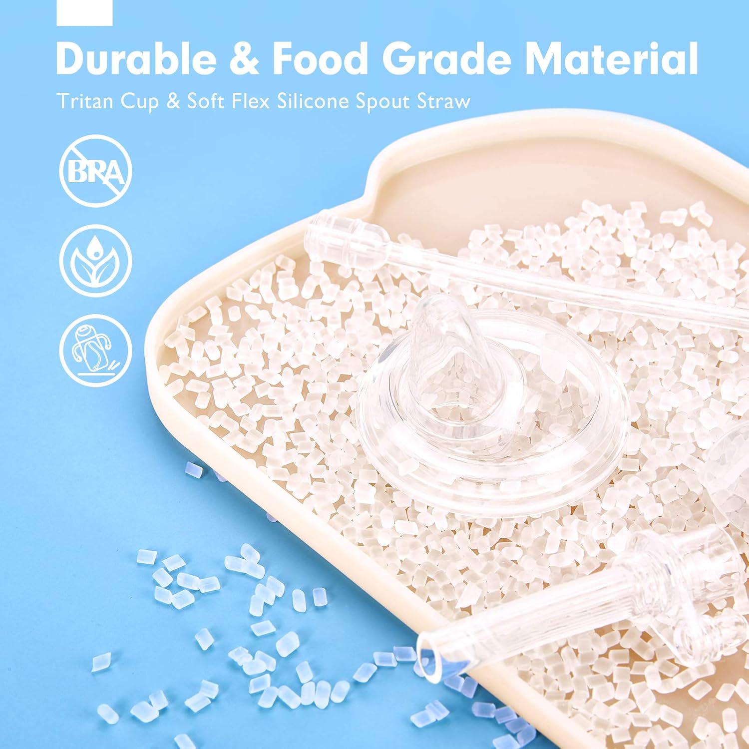 - Food Grade Material and Healthy to Drink: The sippy cup is made of ultra-durable TRITAN material that is BPA-free, non-toxic, which is very healthy for the baby to use. Our toddler sippy cups are highly broken proof that can withstand being tossed from a high chair or stroller. Both spout and straw are made of food-grade soft flex silicone, which is proof to bite and pull, flexible and does not hurt the baby's mouth and emerging teeth, and will help the baby's gums growing