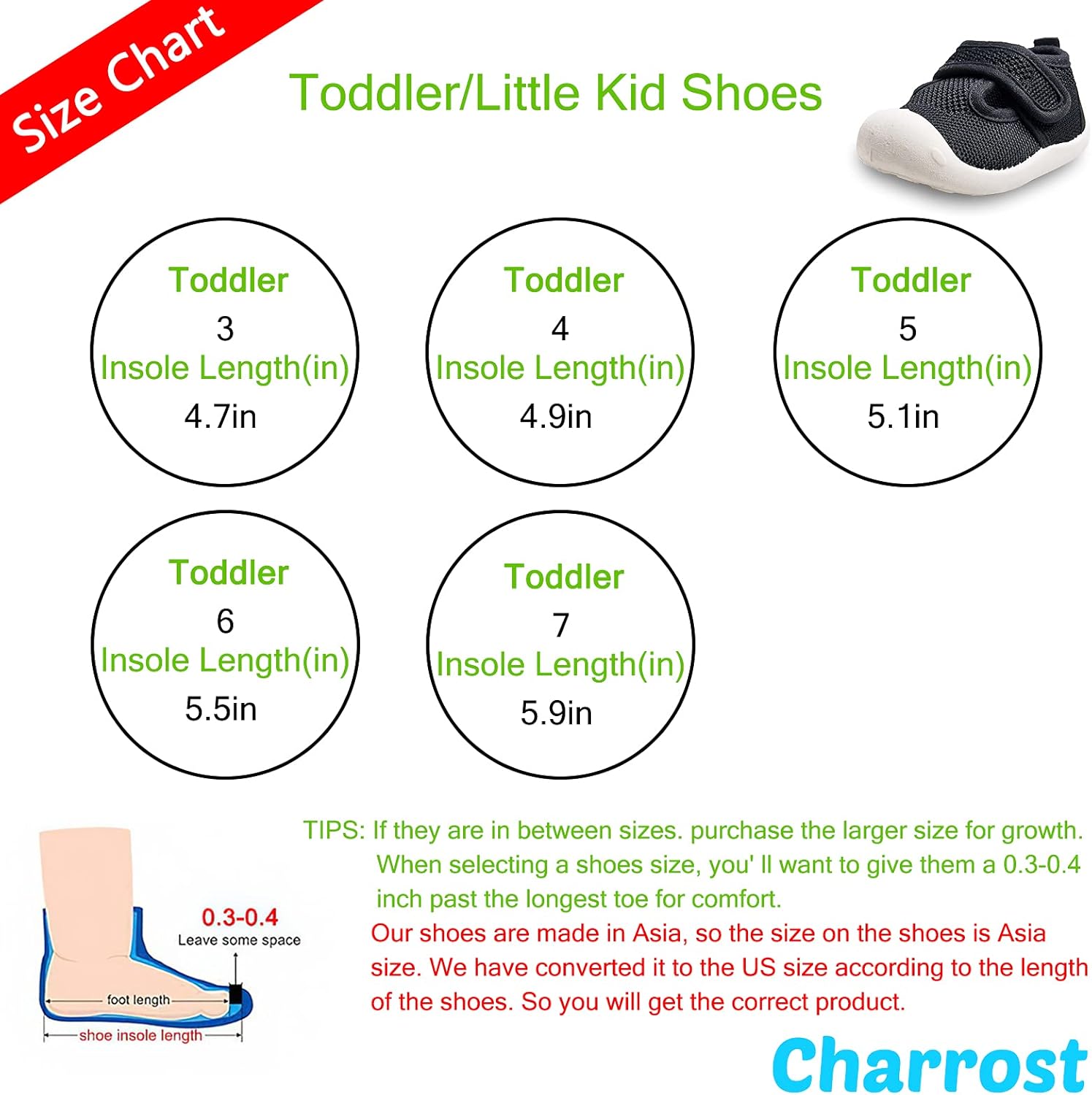 - Size,Suitable for 1-3 year-old children. US 3 Toddler: Insole length: 4.7 in(Tag size:14); US 4 Toddler: Insole length: 4.9 in(Tag size:15); US 5 Toddler: Insole length: 5.1 in(Tag size:16); US 6 Toddler: Insole length: 5.5 in(Tag size:18); US 7 Toddler: Insole length: 5.9 in(Tag size:20)