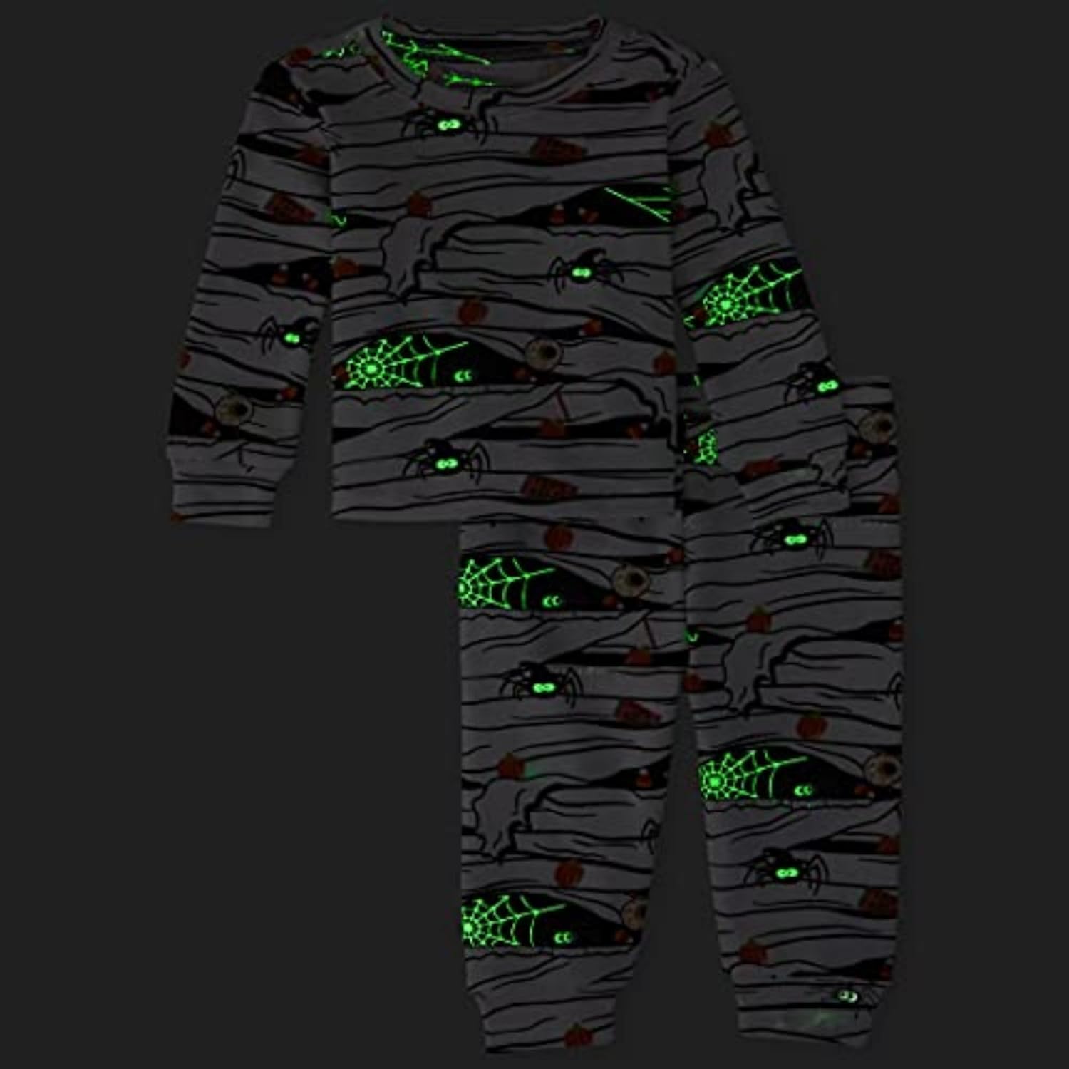 - Pants have allover mummy and candy print that glows in the dark; styled with pull-on elasticized waistband and rib-knit banded leg cuffs
