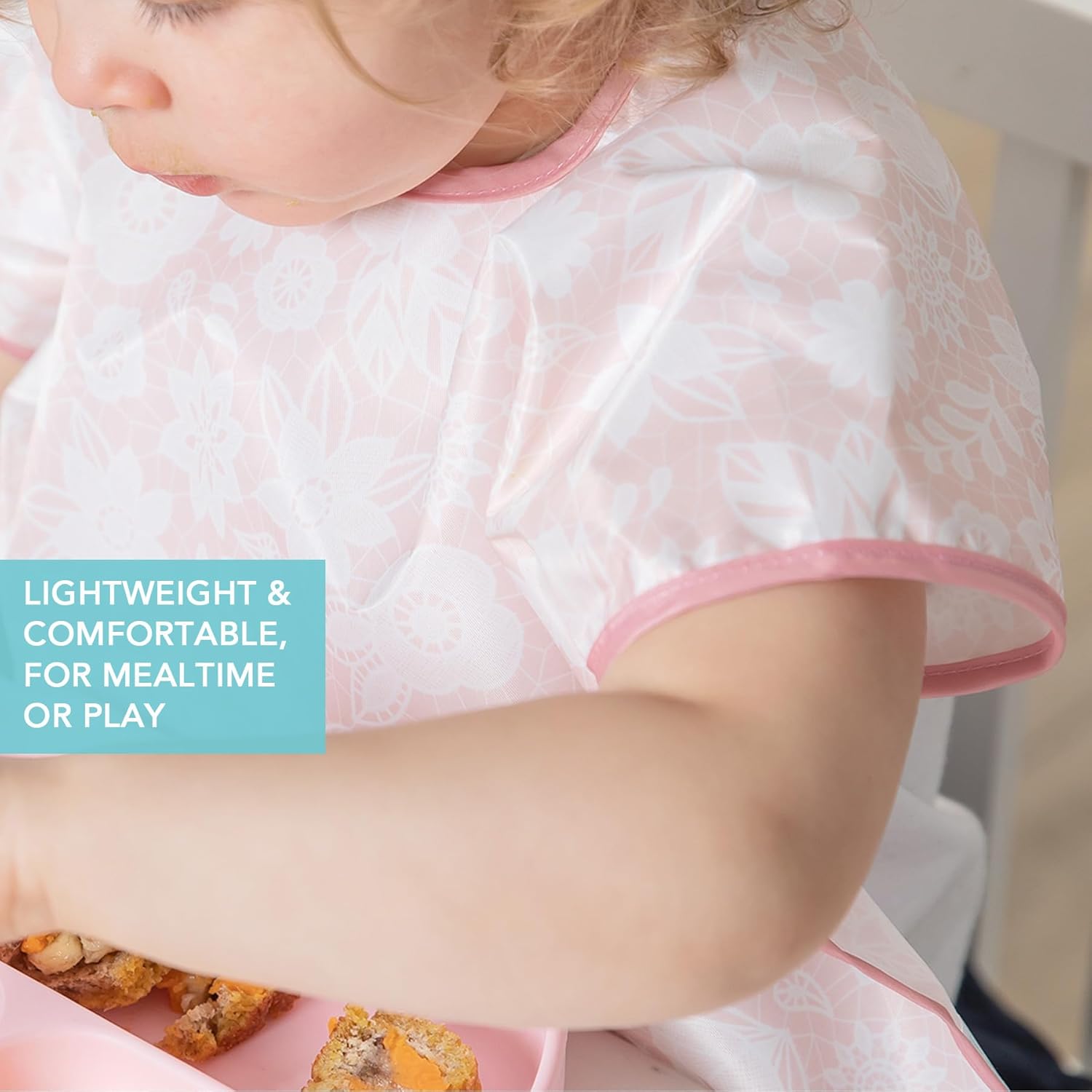• ESSENTIAL FOR TODDLERS AND KIDS – Fits boys and girls ages 1-3 years; mess-proof – created for keeping them clean, the short-sleeve Junior Bib with back hook and loop closure allows for a quick, adjustable and tug-proof fit; approximately 15in across, 14in from neck down and 16in sleeve to sleeve