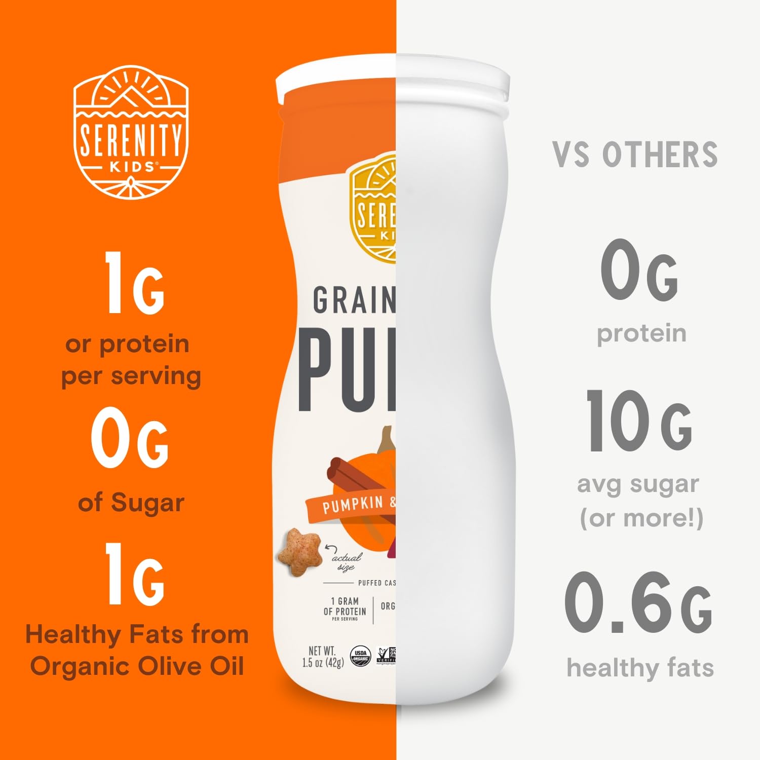 Serenity Kids 6+ Months Grain Free Puffs Toddler & Baby Snack | No Added Sugar, Gluten & Rice Free, Allergen Free | Made with Organic Cassava, Veggies, and Herbs | Pumpkin & Cinnamon | 1 Count