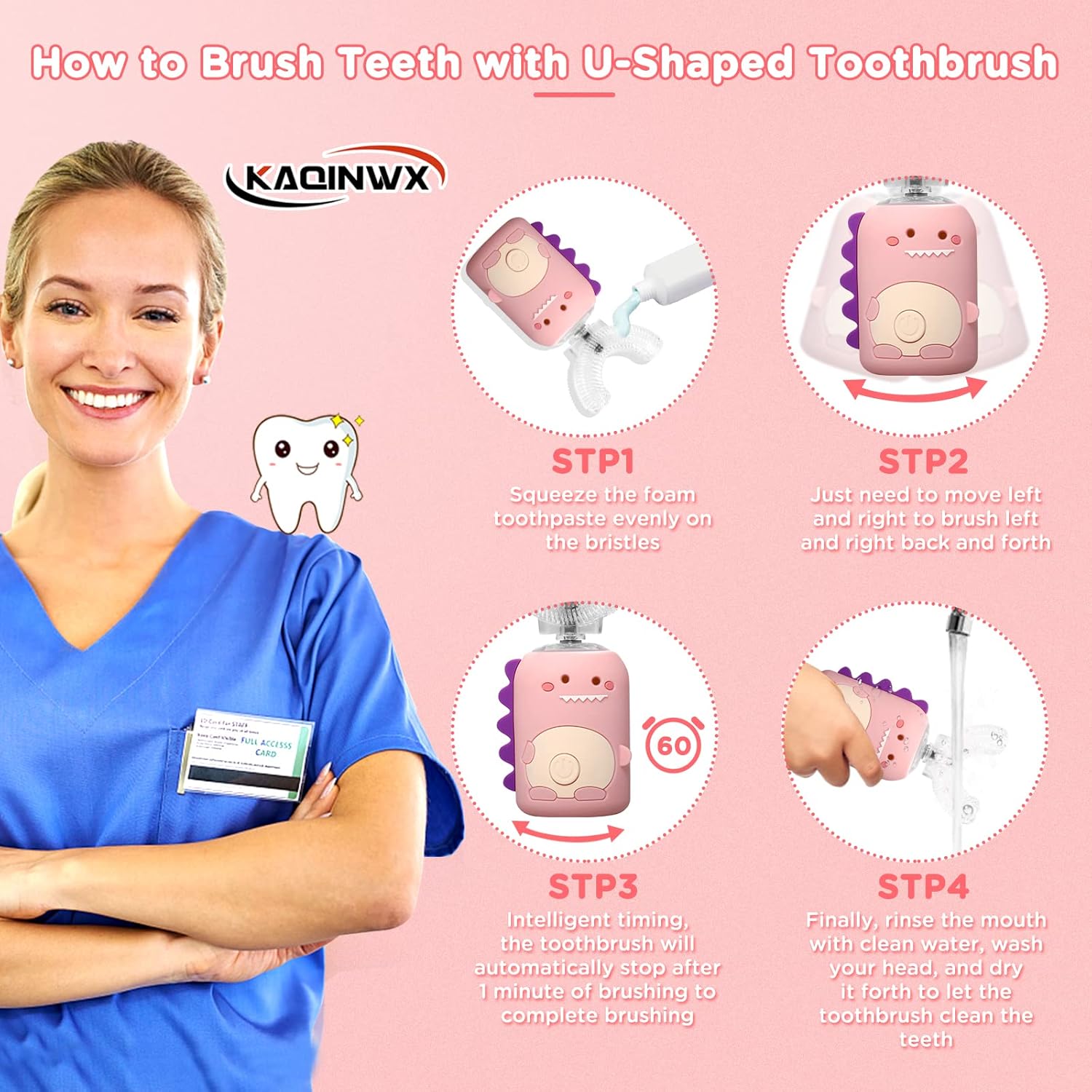 - [Dinosaur Design]: Fun dinosaur-shaped kids toothbrush promotes oral care; Features 360° cleaning for thorough teeth coverage; Ideal for pink toddler toothbrush age two-four; IPX7 waterproof for safe bath-time use; Ergonomic U-shaped design for easy handling
