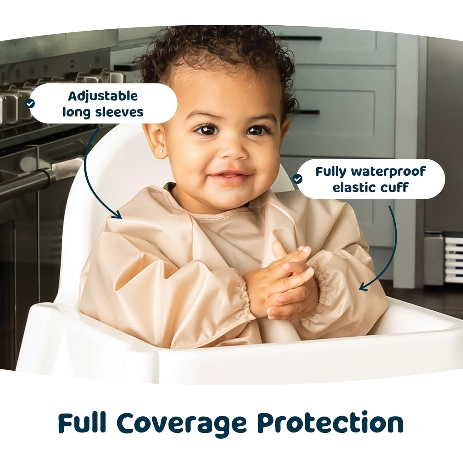 Tiny Twinkle Mess Proof Baby Bibs, 2pk Waterproof Smock Baby Bibs for Eating, Machine Washable Long Sleeve Bibs, Baby Led Weaning, Toddler Bibs, BLW Supplies (Sand Cinnamon, Small 6-24 Months)