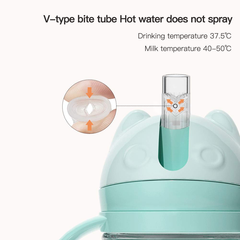 - LEAK-PROOF: V-type bite tube, features a leak-proof cover, baby can drink easily without choking. Recommended the maximum temperature is below 109℃. (Drinking temperature is suitable for 37.5℃; Milk temperature is suitable for 40-50℃).