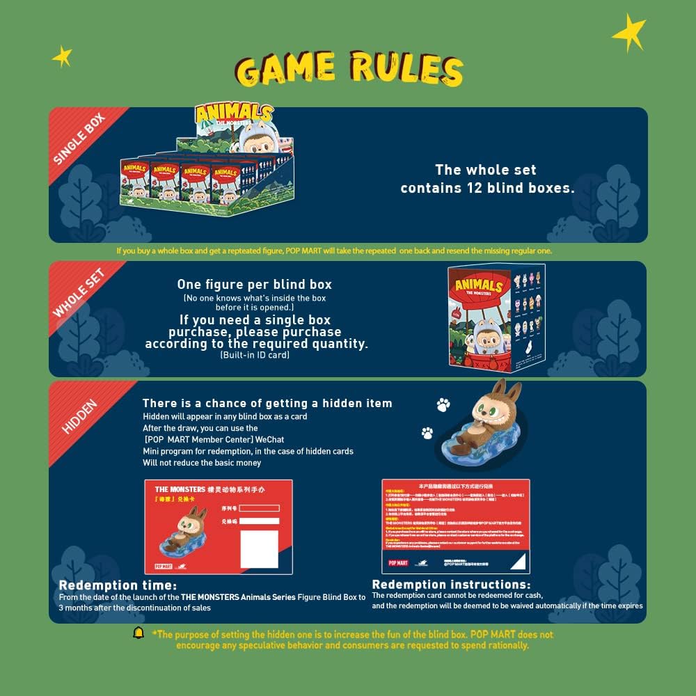 - POP MART THE MONSTERS Animals Series: The blind box contains a random figure from a specific series. Each blind box only contains one figure. No one, including us, knows what's inside. This collection contains 12 blind box figures, one of them might be the secret edition.