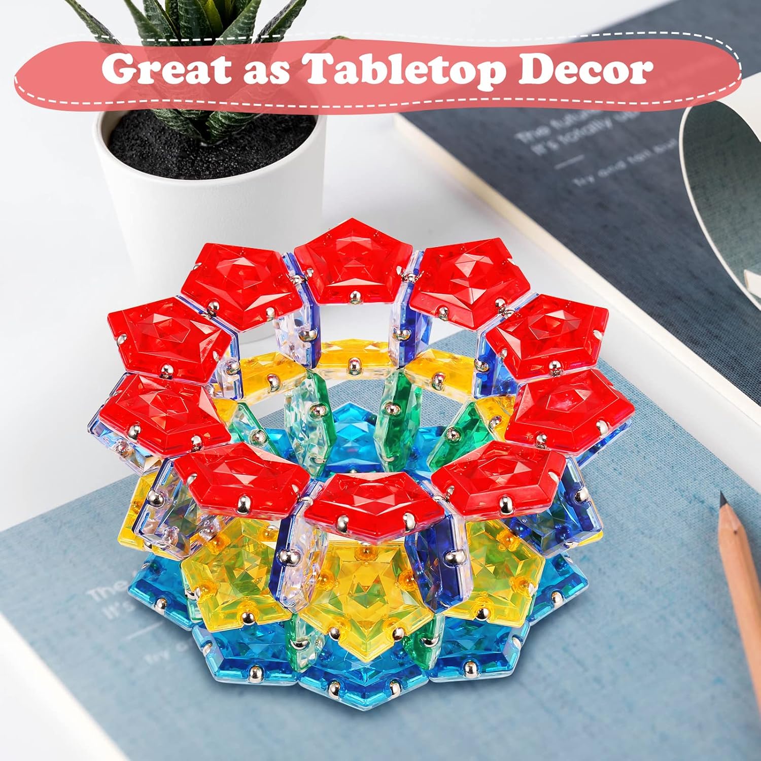 - [Develop Your Spatial Thinking]: Fold, shake, spin and stack the pieces. Connect the pentagonal plates together into sculpture-like forms. Click and clack the pieces around in a satisfying symphony of kaleidoscopic visuals. Flick your fingers like twisting tendrils as the magnetic ball transmogrifies your mind. Captivating 3D art!