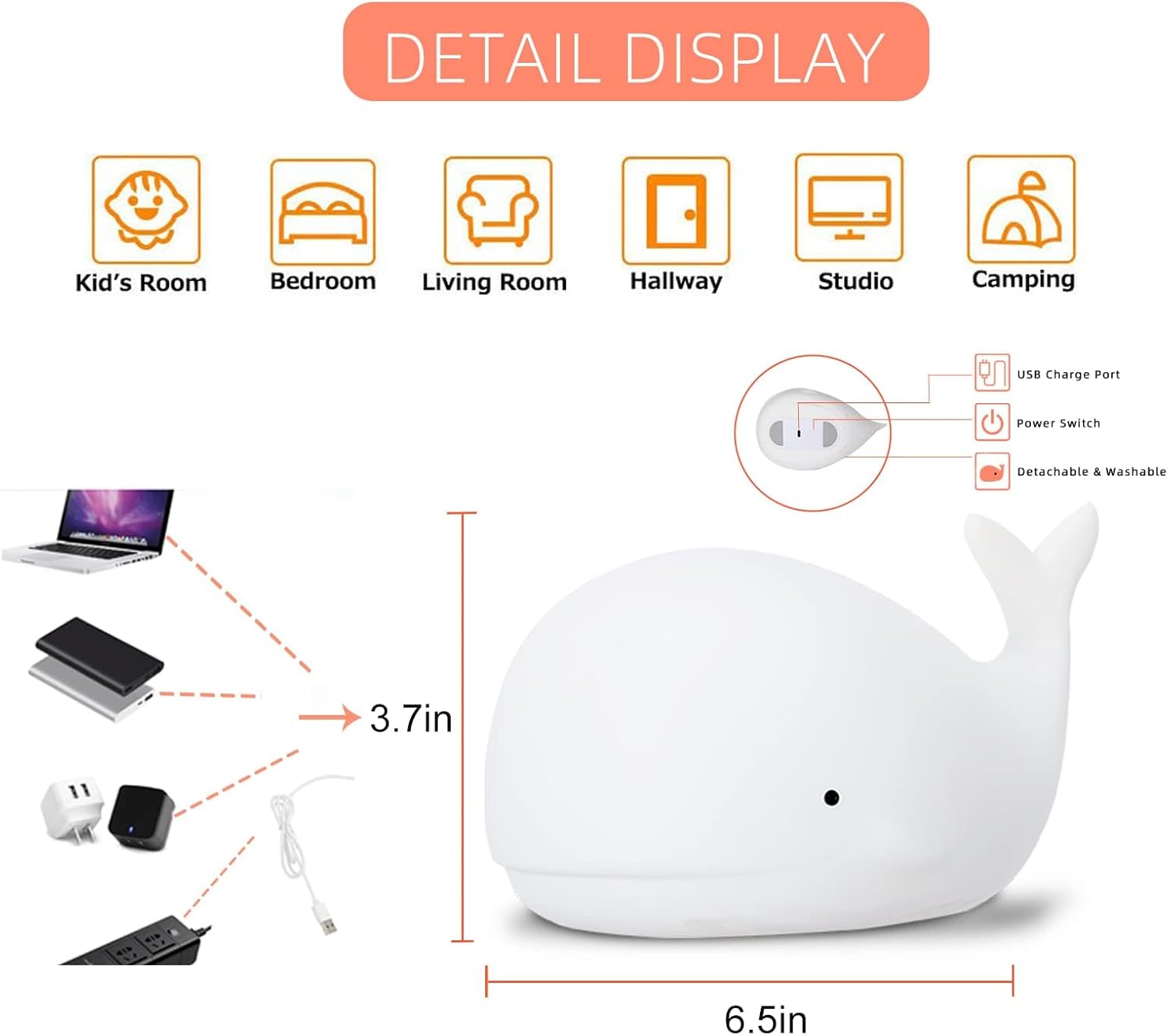 LOVERUIS Whale Night Light Silicone 7 Colors Dimmable 3 Hours Timer Whales Baby Light Decor Room Ocean Baby Nursery Decors Gift Kids