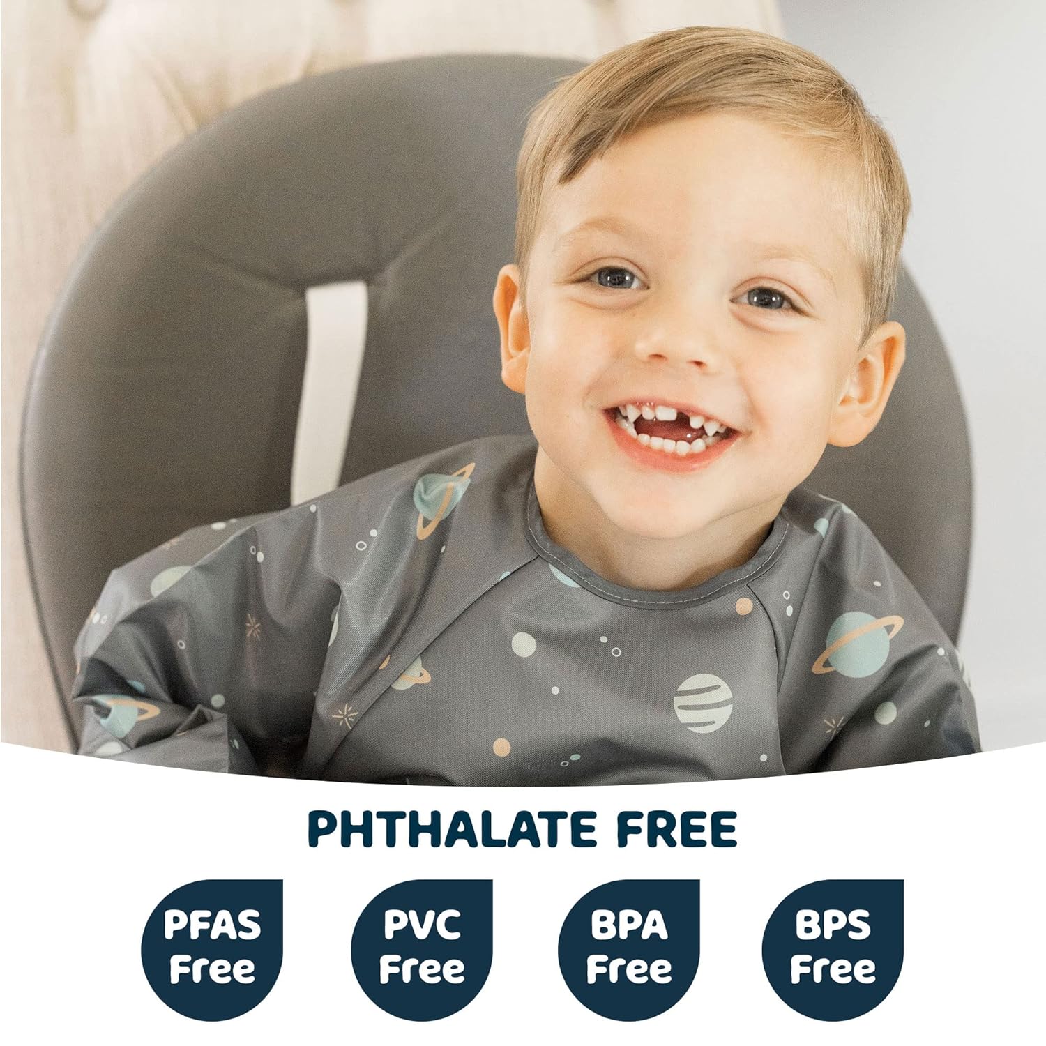 - TRAVEL BUDDY:The must-have baby feeding essentials for on-the-go parents! Our long sleeve waterproof smock bib (fits 6-24 months) is a versatile wipeable bibs with scratch-free closures and 360 degrees puree-proof protection.This bib with sleeves is perfect for plane or car meals, It folds flat in diaper bags,handles baby-led weaning messes and makes a great gender-neutral baby shower gift.Ideal for parents needing baby eating essentials on the go.