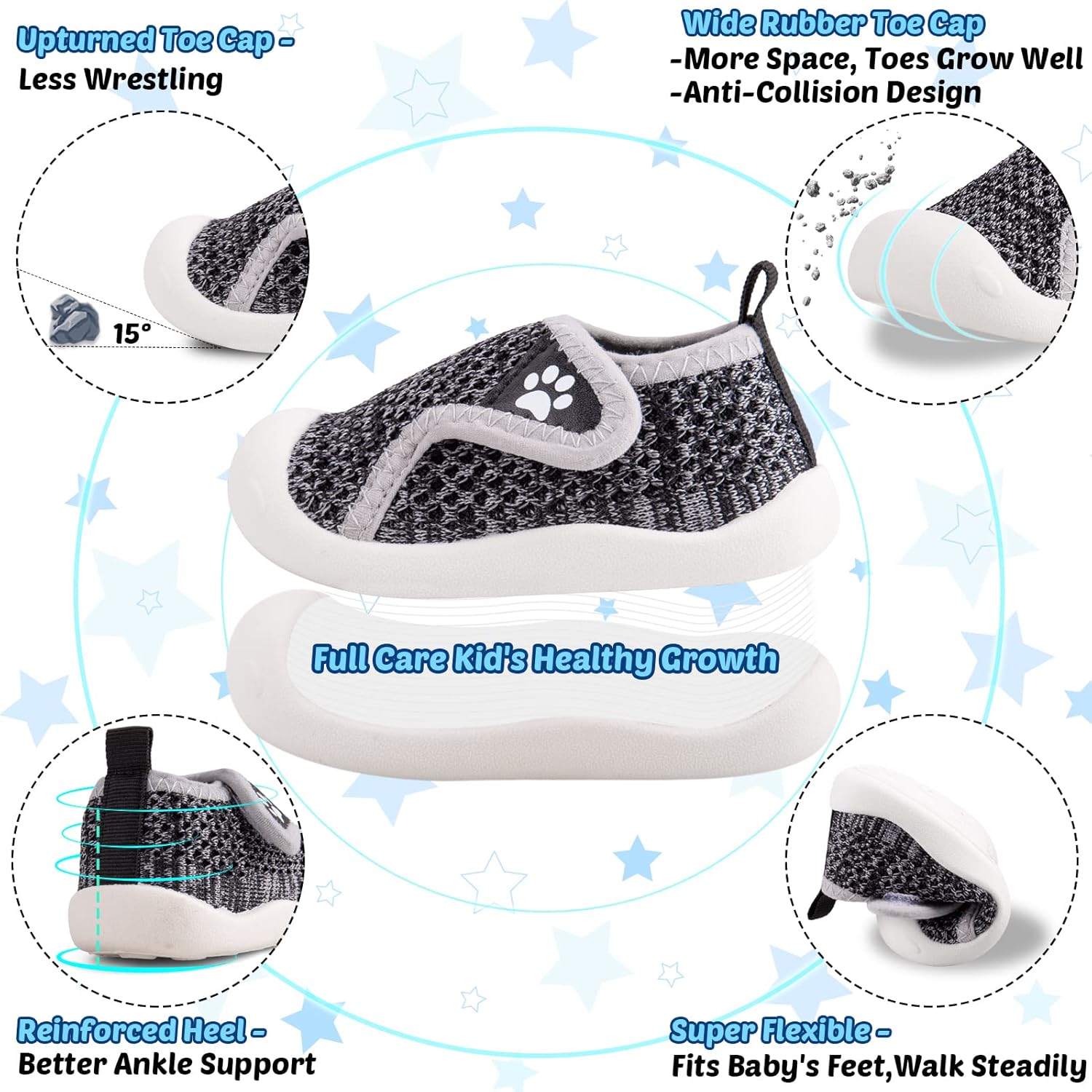 - Designed for Kid's Healthy Growth: Toddler shoes indoor outdoor has a anti-collision rubber toe cap design to protect baby's feet from injuries, extra wide width toe cap with more room for good toes growth. Reinforced Heel provides better ankle support. Soft and flexible shoe sole makes kids walk comfortablely and steadily.