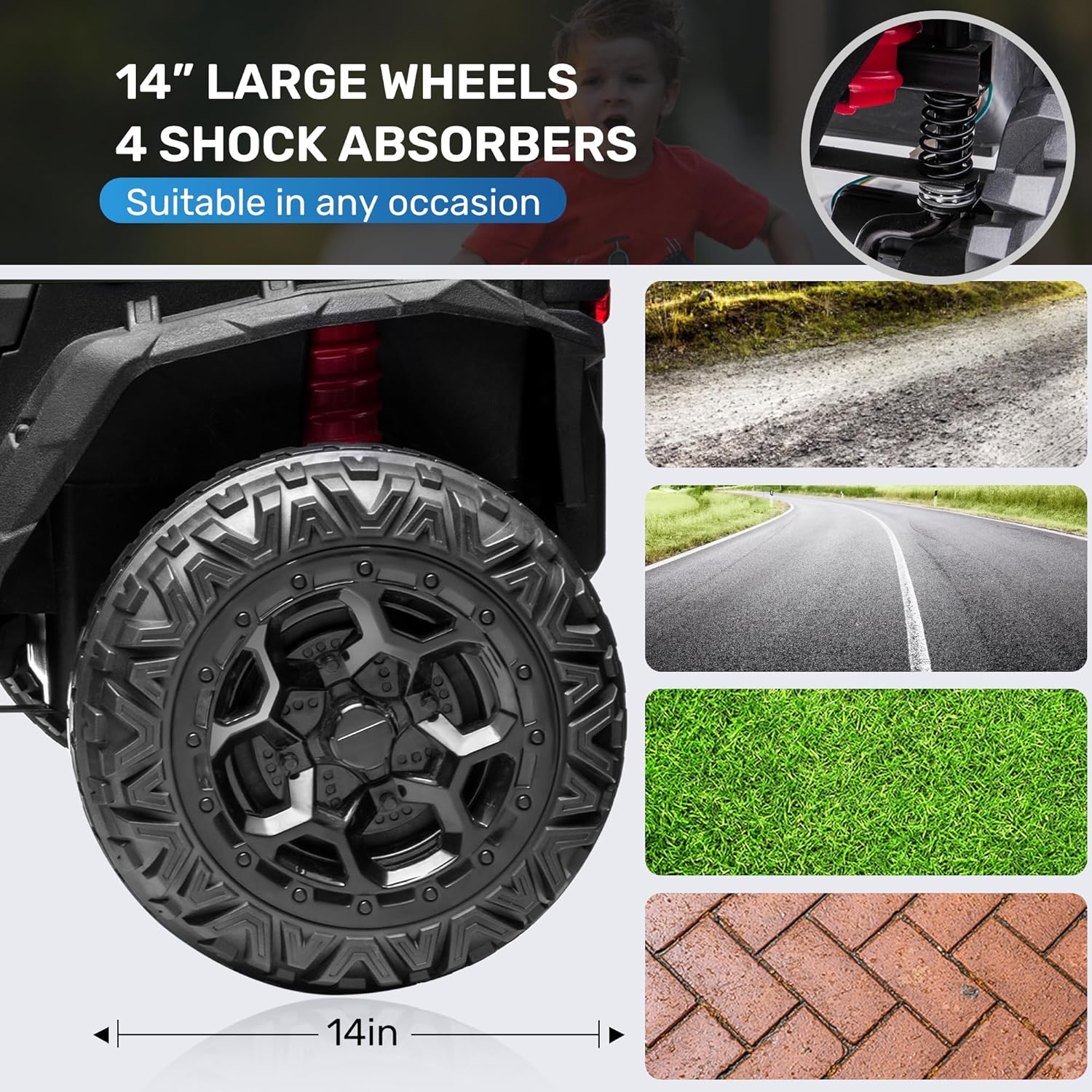 - GOOD CHILDHOOD PLAYMATE: 19-inch capacious seat, 14-inch large wheelbase and high chassis enable the car to bear 110 lbs weight, accommodate one big children (under 4.5ft heigt) or 2 small toddlers (under 3.4ft heigt) ; with an adjustable 4-point seat belt, this electric vehicle is a good playmate for your little ones