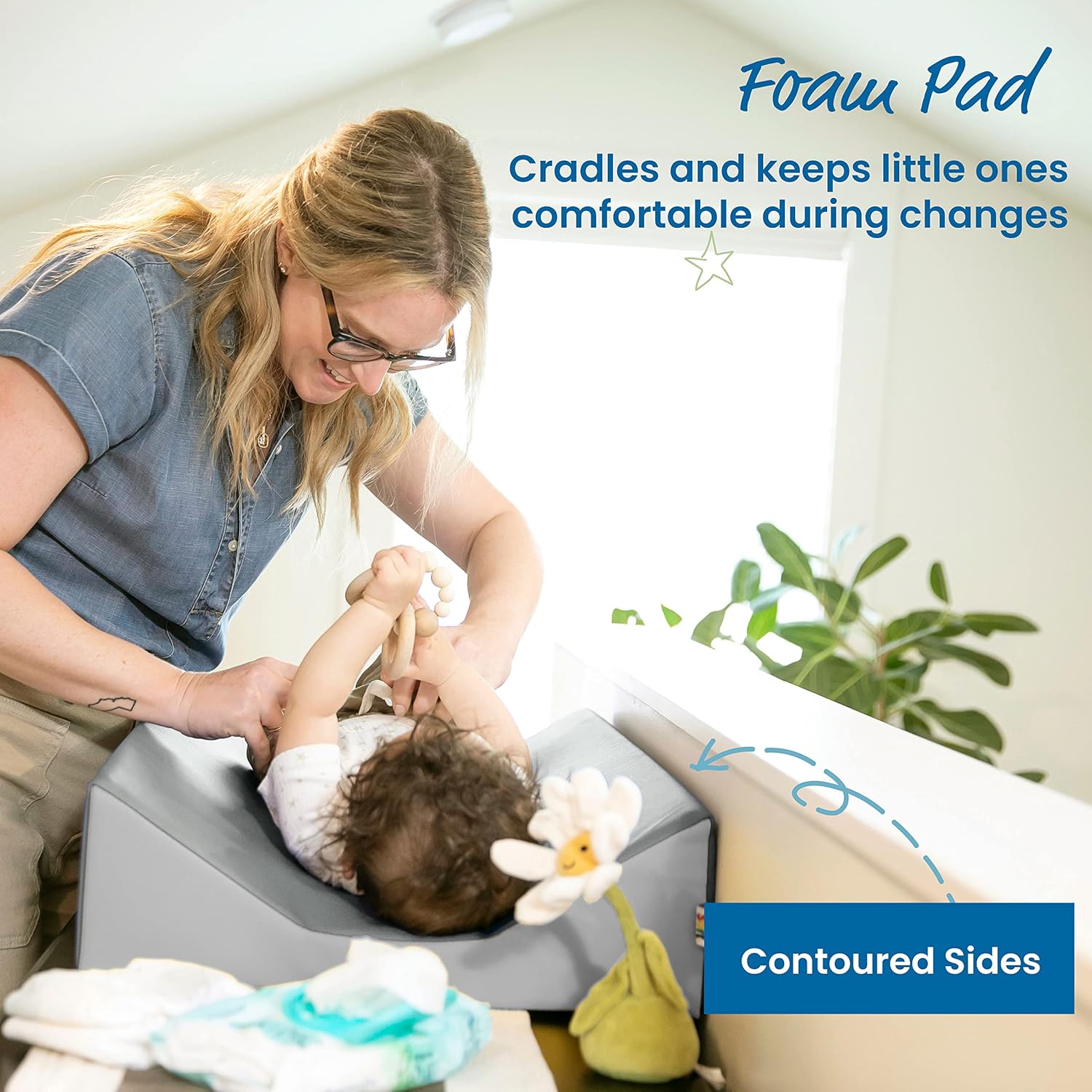 - Cozy Design: Use on any safe, flat surface, the plush pad cradles infants and babies and allows caregivers to face the child when changing diapers; the wide base features a non-slip bottom