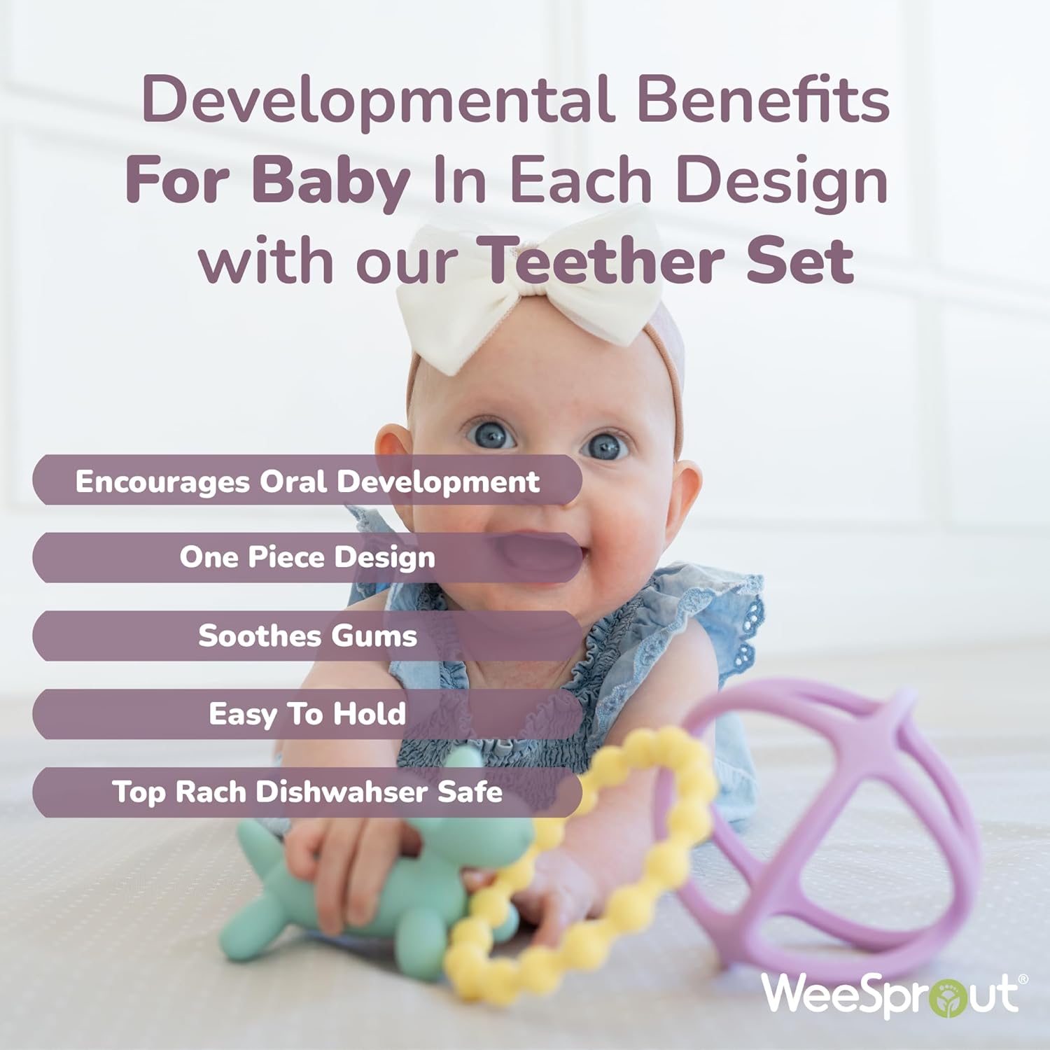WeeSprout Silicone Baby Teether Toys for Infant Babies and Toddlers, Cute Ring, Puppy Dog, and Ball, Soft and Flexible, BPA Free, Boys and Girls (Matte Green, Pink & Off White)