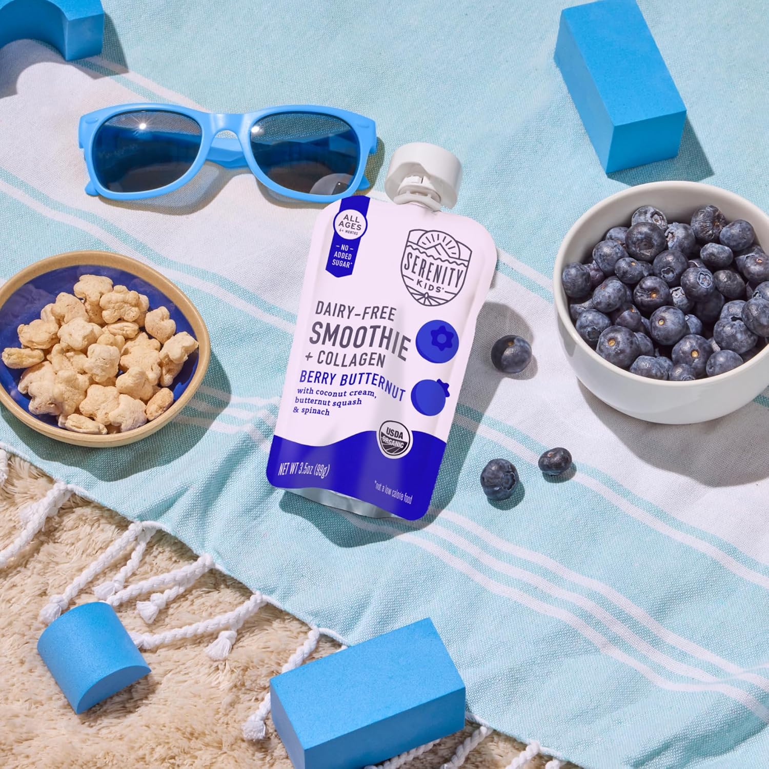 Serenity Kids 6+ Months Dairy-Free Smoothie Baby Food | USDA Organic | Grass Fed Collagen Protein | 3.5 Ounce BPA-Free Pouch | Berry Butternut | 12 Count