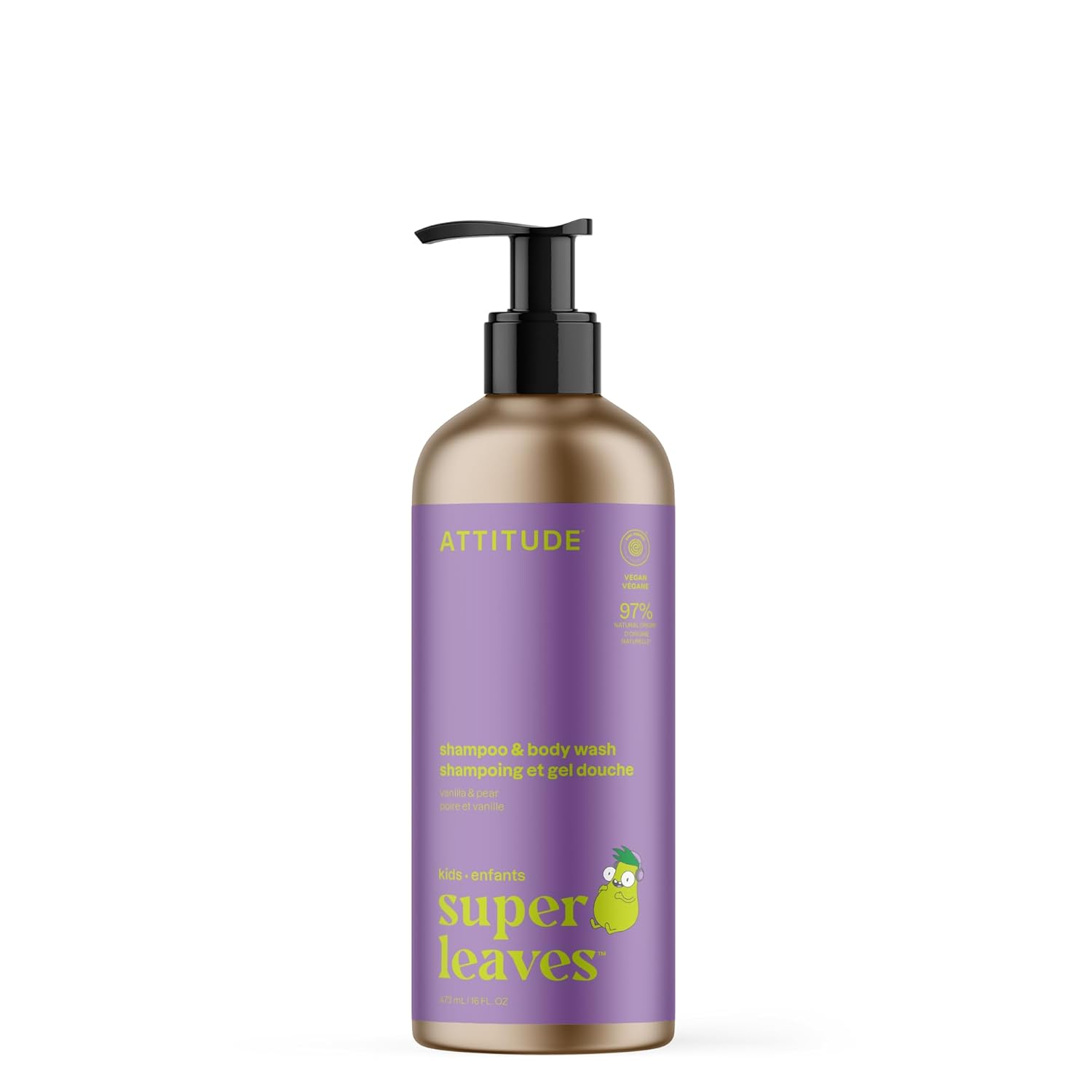 ATTITUDE Shampoo and Body Wash for Kids, EWG Verified Hair and Body Cleanser, Dermatologically Tested Soap, Plant and Mineral Based Bath Products, Vegan, Refillable Bottle, Vanilla and Pear, 16 Fl Oz