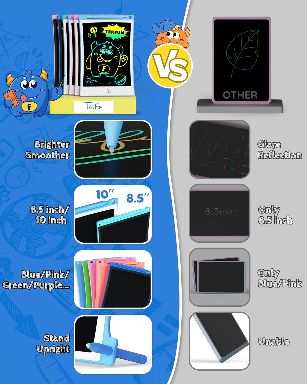 - Eye-protecting Colorful Screen: Eyes Are The Window To The Soul. Too much screen time on electronics will hurt kids' eyesight. The TEKFUN doodle board LCD screen with no blue light, no glare, radiation-free, but can depict a dreamy and colorful world and writes in "rainbow". Eyes will not be tired at all even for long-time use.