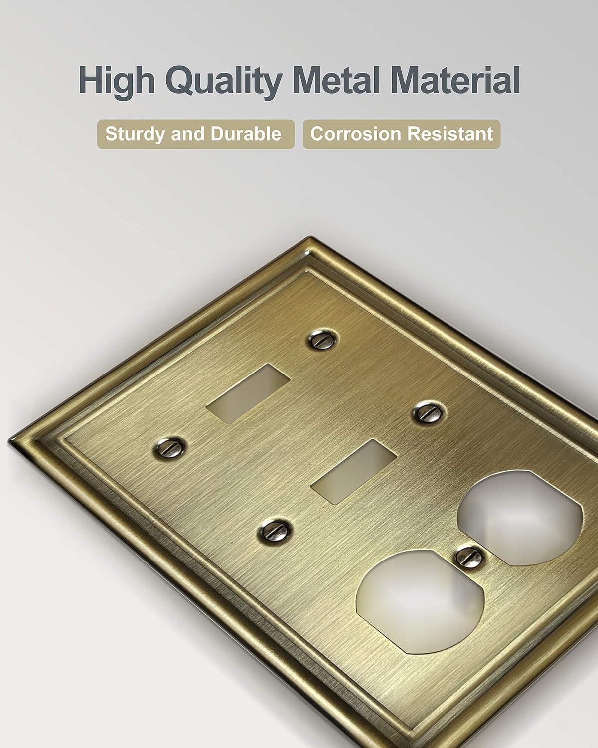 Combination 2 Toggle and 1 Duplex Metal Wall Plate, 3-Gang Switch Plates and Outlet Covers, Decorative Antique Brass Finish, Corrosion Resistant, 2-Pack, Midsize