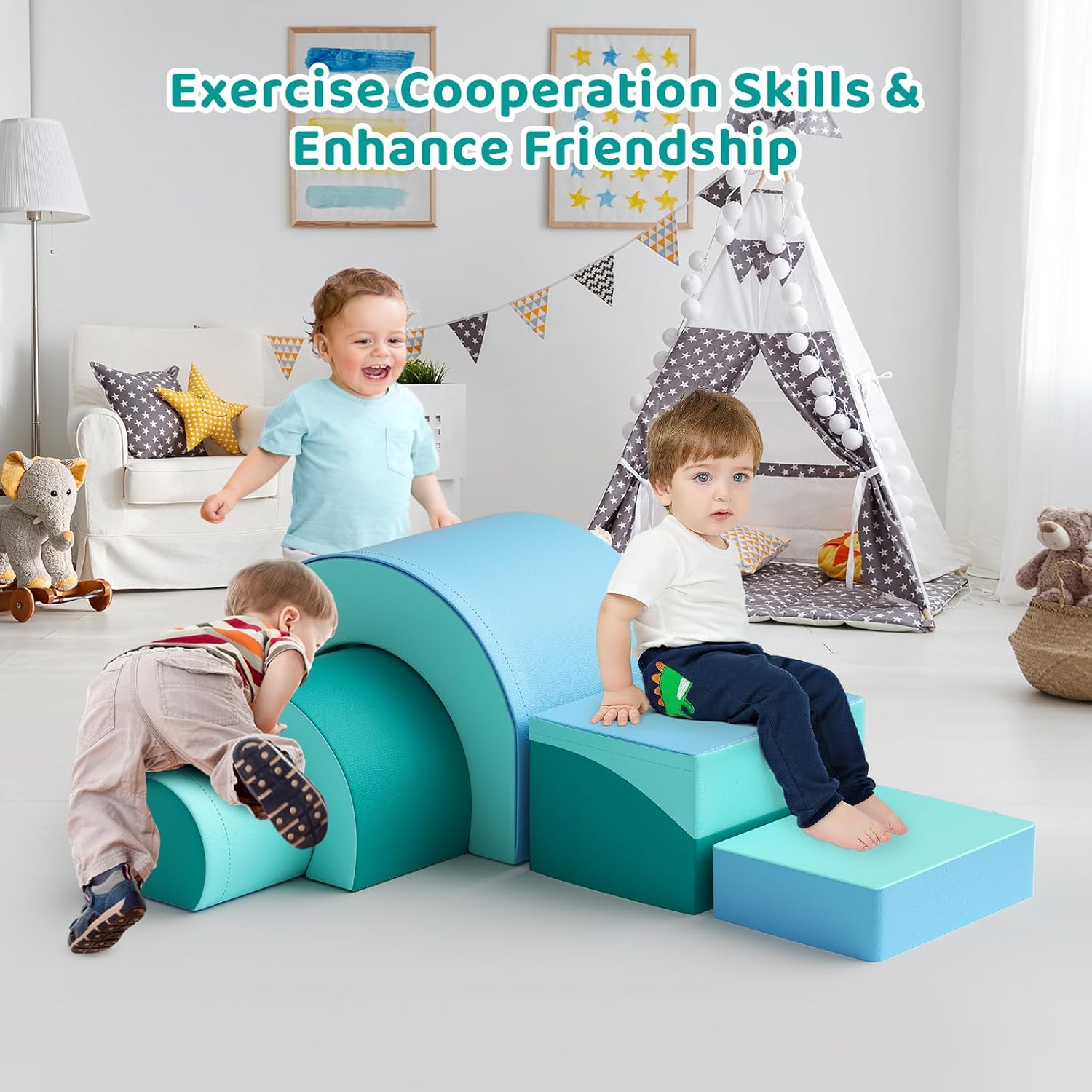 Lischwert Foam Climbing Blocks, Soft Climbing Toys for Toddlers, 5 Pieces Crawl and Climb Foam Playset with Foldable Block and Tunnel, Indoor Climber Activity Play Set for Kids Age 1+