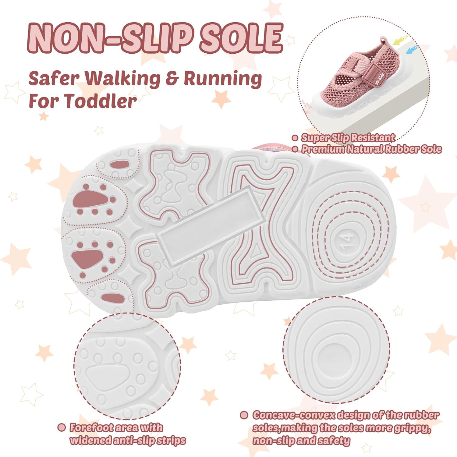 • Anti-skid&Shock Absorption: Toddler's Athletic Sneakers have a natural rubber outsole with high elasticity, effectively absorbing impact and distributing force evenly across the foot. The sole's unique cat's claw-inspired design enhances grip, preventing slips and aiding balance when toes touch the ground. Let your baby play happily and agilely, just like a cat.
