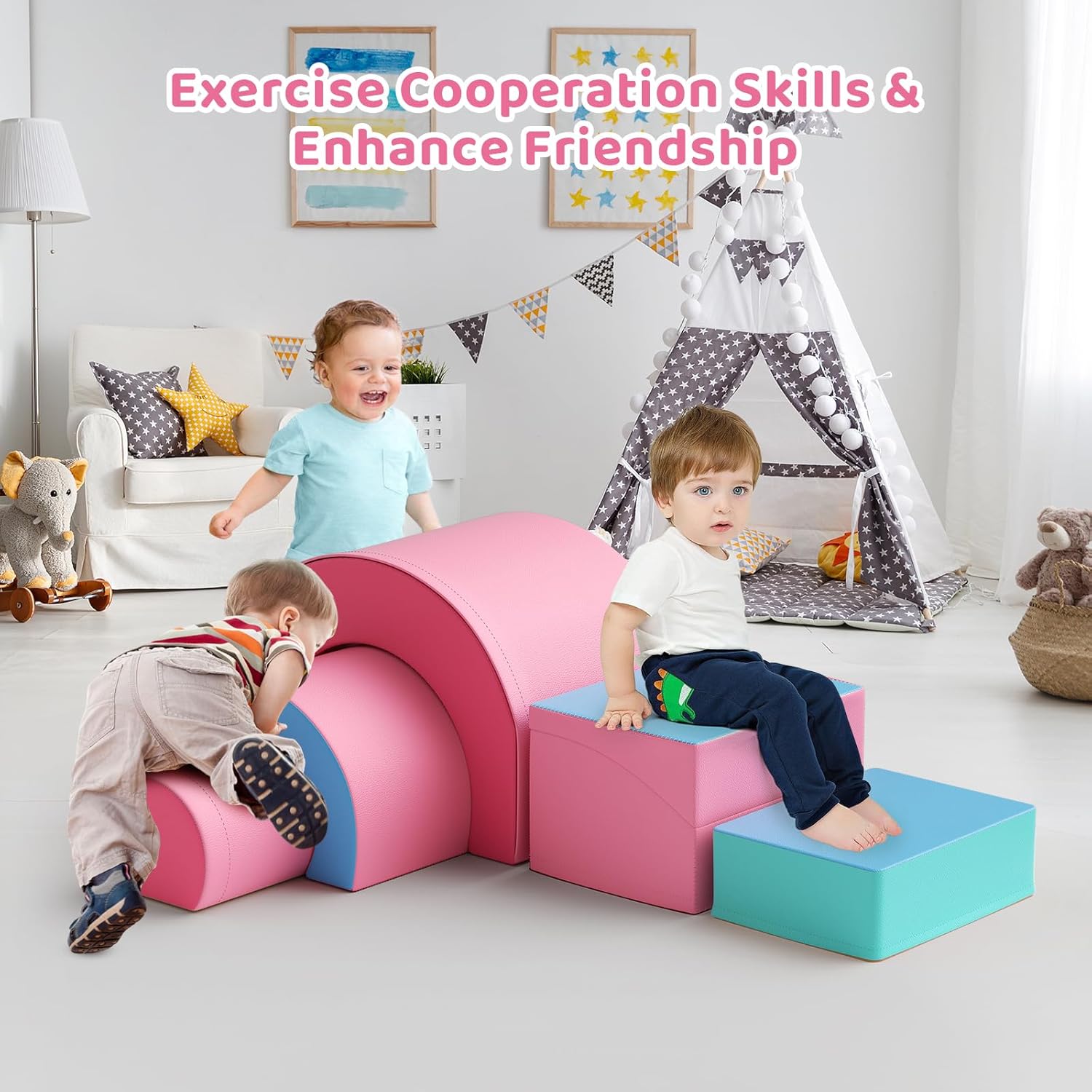 Lischwert Foam Climbing Blocks, Soft Climbing Toys for Toddlers, 5 Pieces Crawl and Climb Foam Playset with Foldable Block and Tunnel, Indoor Climber Activity Play Set for Kids Age 1+(Pink Blue)