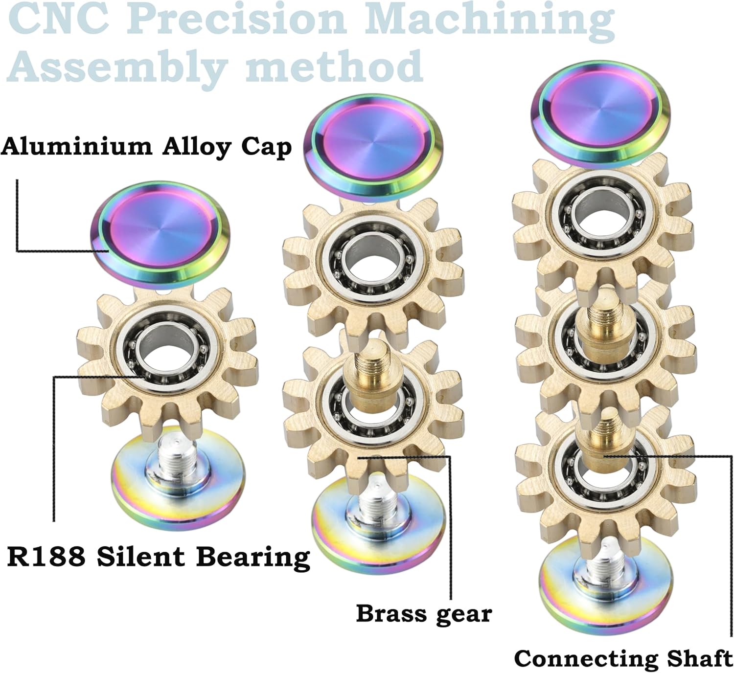 - [Cool Spin] It fantastic spins, brass gear spinning is visually appealing for sure. The gears rotate smoothly on your fingers. The high-speed rotating gear can run vertically on the table like a wheel. Multiple gear gyroscopes running together makes much more fun.