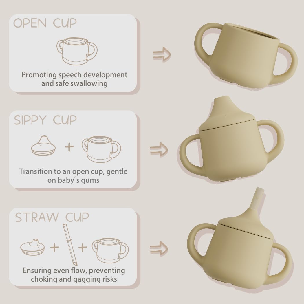 - 【Three-in-one Design (with straw + spout + open cup)】 Our baby cup features a versatile three-in-one design that can be converted from a sippy cup to a straw cup to an open cup, encouraging your baby to develop drinking skills.The open cup promotes lip closure, speech development, and safe swallowing while also preventing tooth decay. Going from a straw to independent drinking is such a huge milestone for early development, so we have designed one cup that will be there for every step.