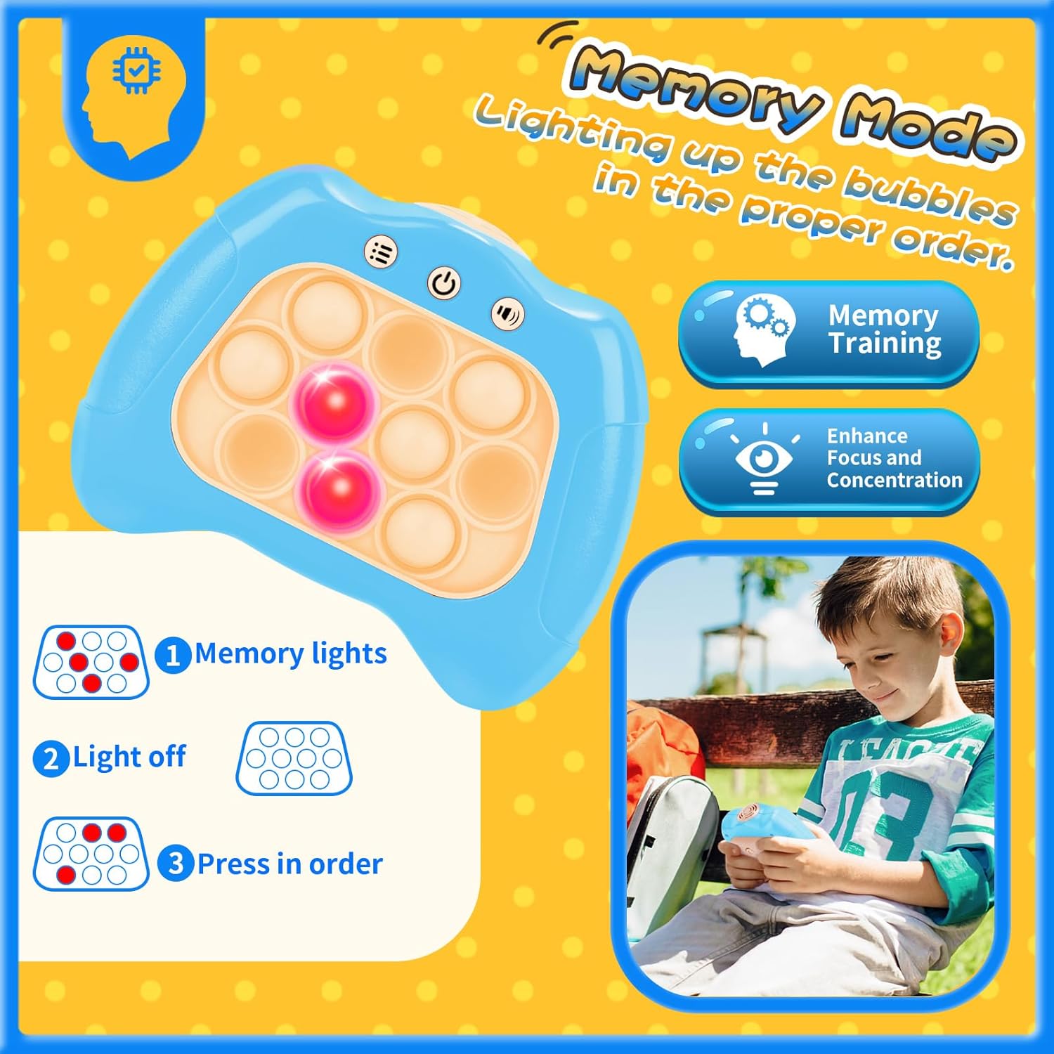 - LIGHT-UP POP FIDGET TOY: Classic pop game meets electronic handheld game! Our newly released quick push bubble game can promote kids sensory development, and engage their positive thinking, hand-eye coordination, and brain training during playing