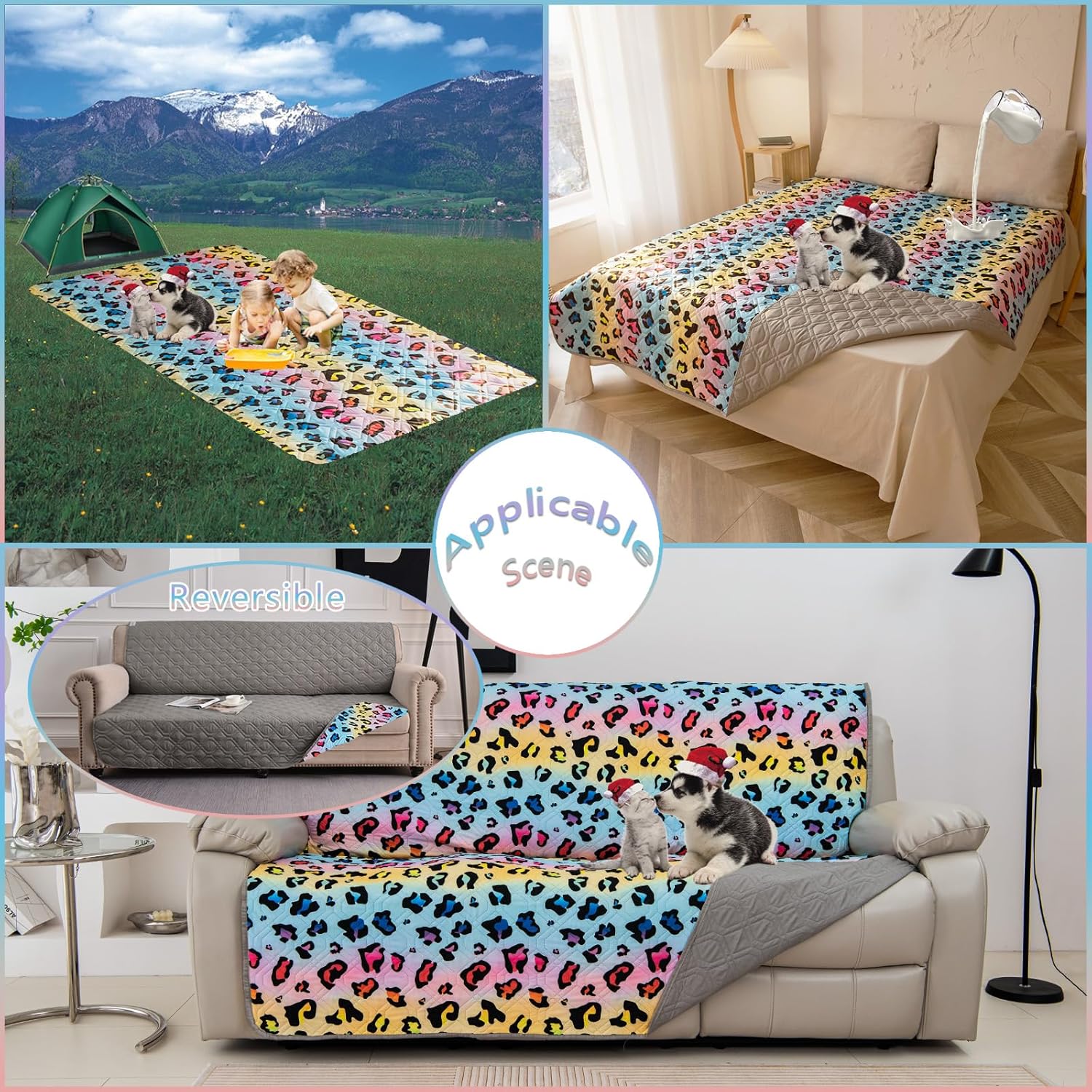 Waterproof Dog Bed Cover 52x82inch Reversible Pad Reusable Camping Mat for Kids/Pet/Dog/Cat Washable Geometric Embroidery Blanket Patchwork Rainbow Leopard Printed+Gray