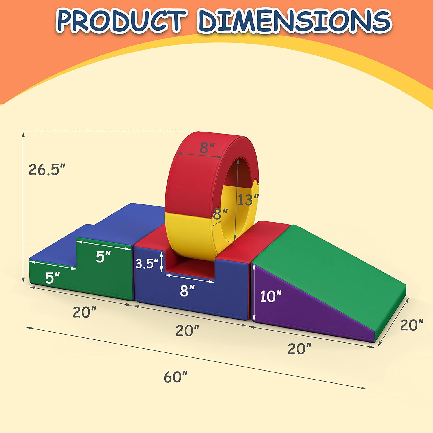 - VERSATILE USAGE: Assembled toddler climbing toys measures 60" L x 20" W x 26.5" H.The inner diameter of the sole circle is 13", enough for toddler to pass through.The colorful foam play set is perfect for indoor use, such as in the living room, amusement park, kindergarten play area, children's training institutions, shopping mall rest areas, etc.