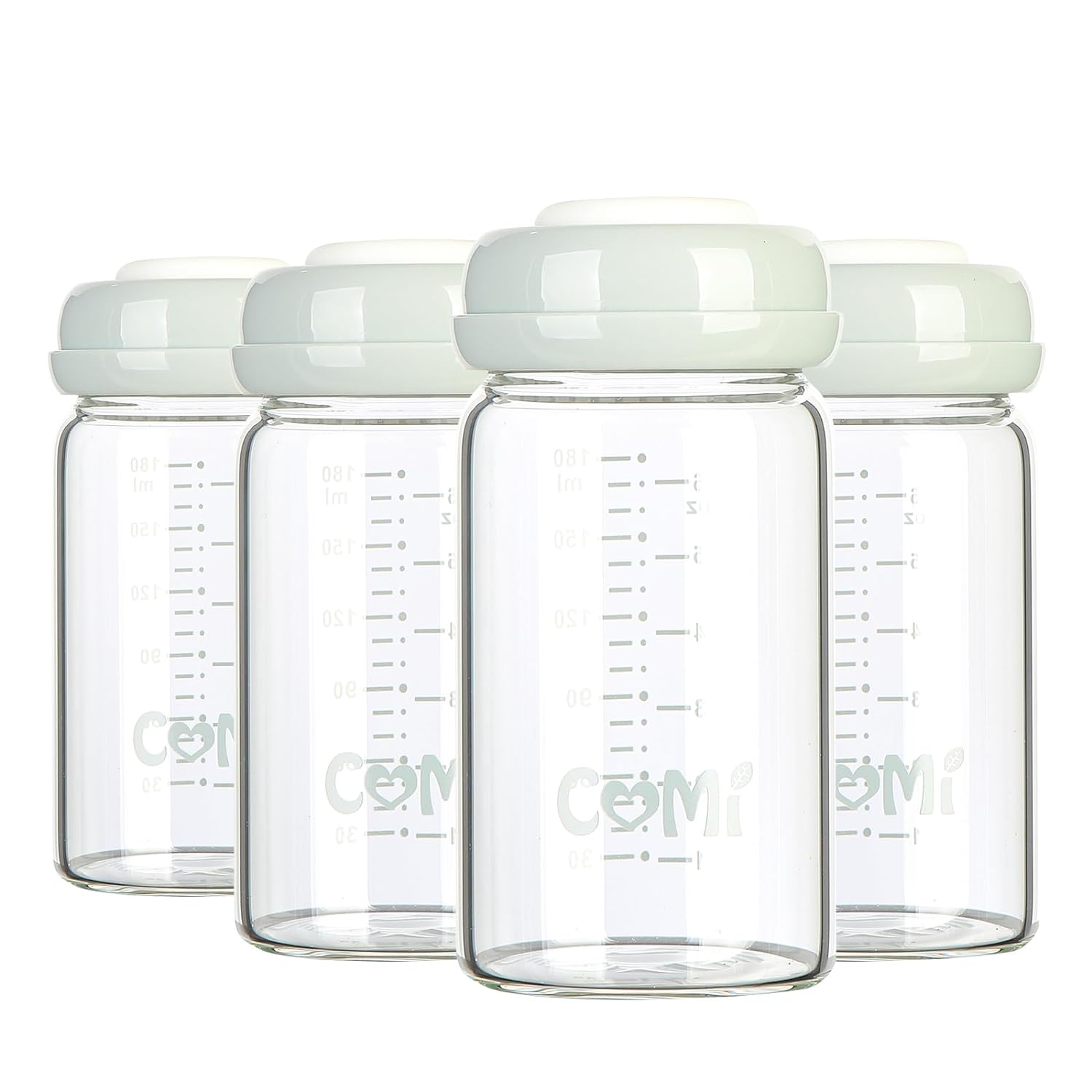 COMI Wide Neck Glass Breastmilk Collection n Storage Bottle, 4 Packs, 6oz with Screw Ring Sealing Disk; Re-markable Sealing Disc. BPA Free, Fits Breast Pumps & Nipples (4 Gray Lids)