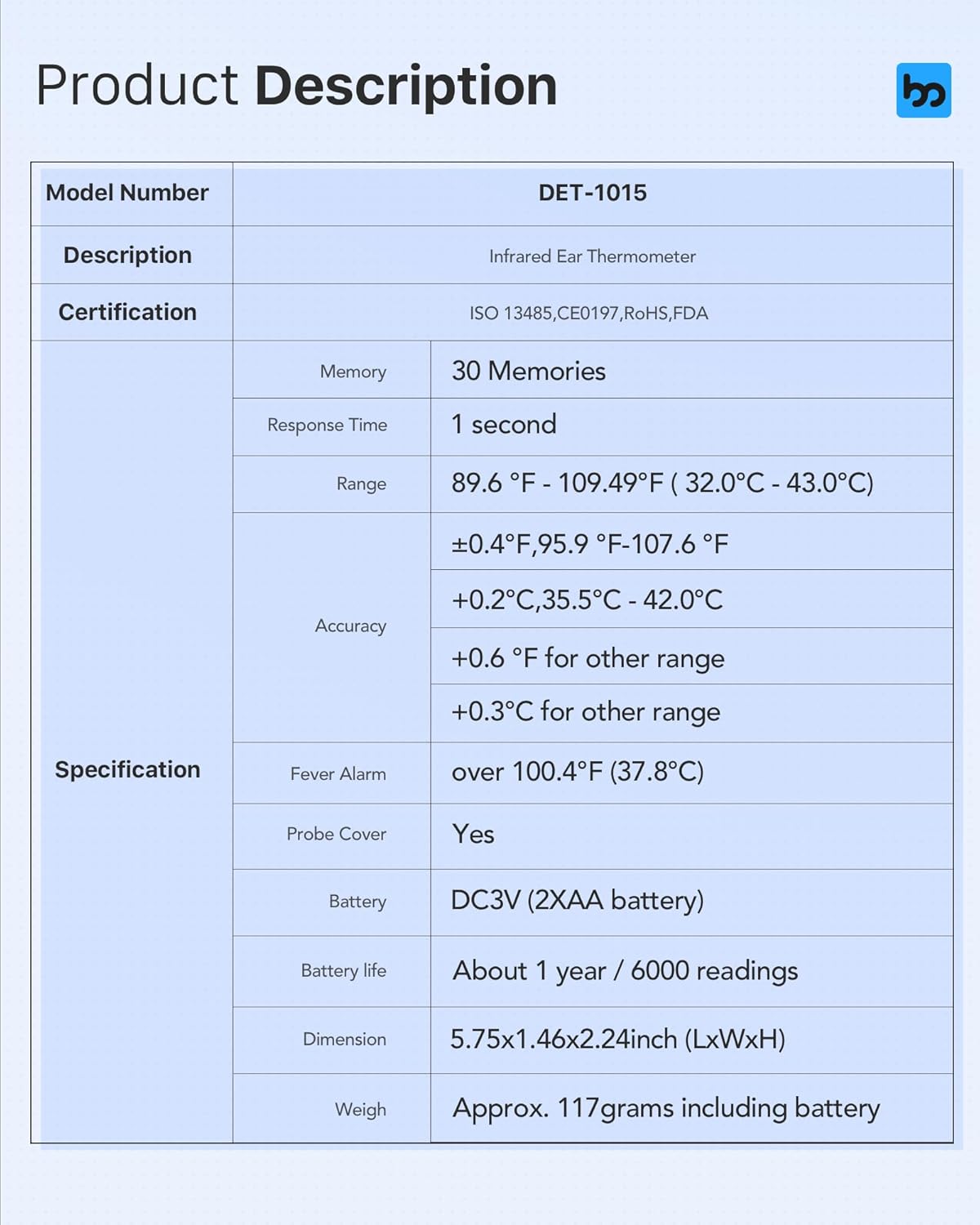 - Included Components : 1×Ear Thermometer, 2×AA Batteries, 24×Probe Covers, 1× Storage Bag, 1×Manual