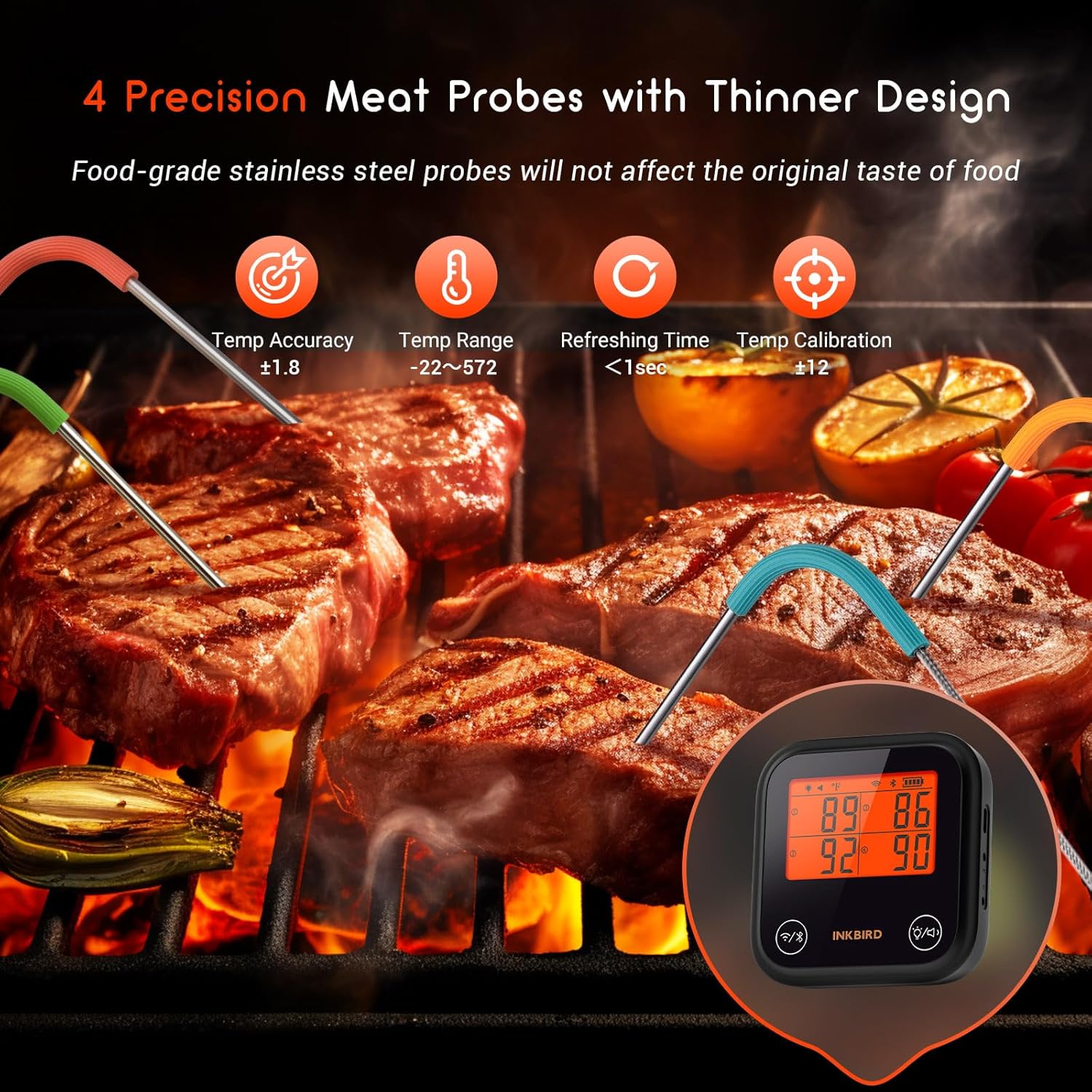 - Upgraded Bluetooth & WiFi Dual Mode Connection: INKBIRD Bluetooth & WiFi Dual Mode Wireless BBQ Thermometer which ensures a more practical remote control range and is more satisfying for barbecuing banquets. The 2.4GHz WiFi module supports an infinite connection distance to let you set, monitor, and optimize your cooking process anytime, anywhere. The Bluetooth 5.3 tech support up to 260ft/80m long-distance a more stable connection and faster data transfer
