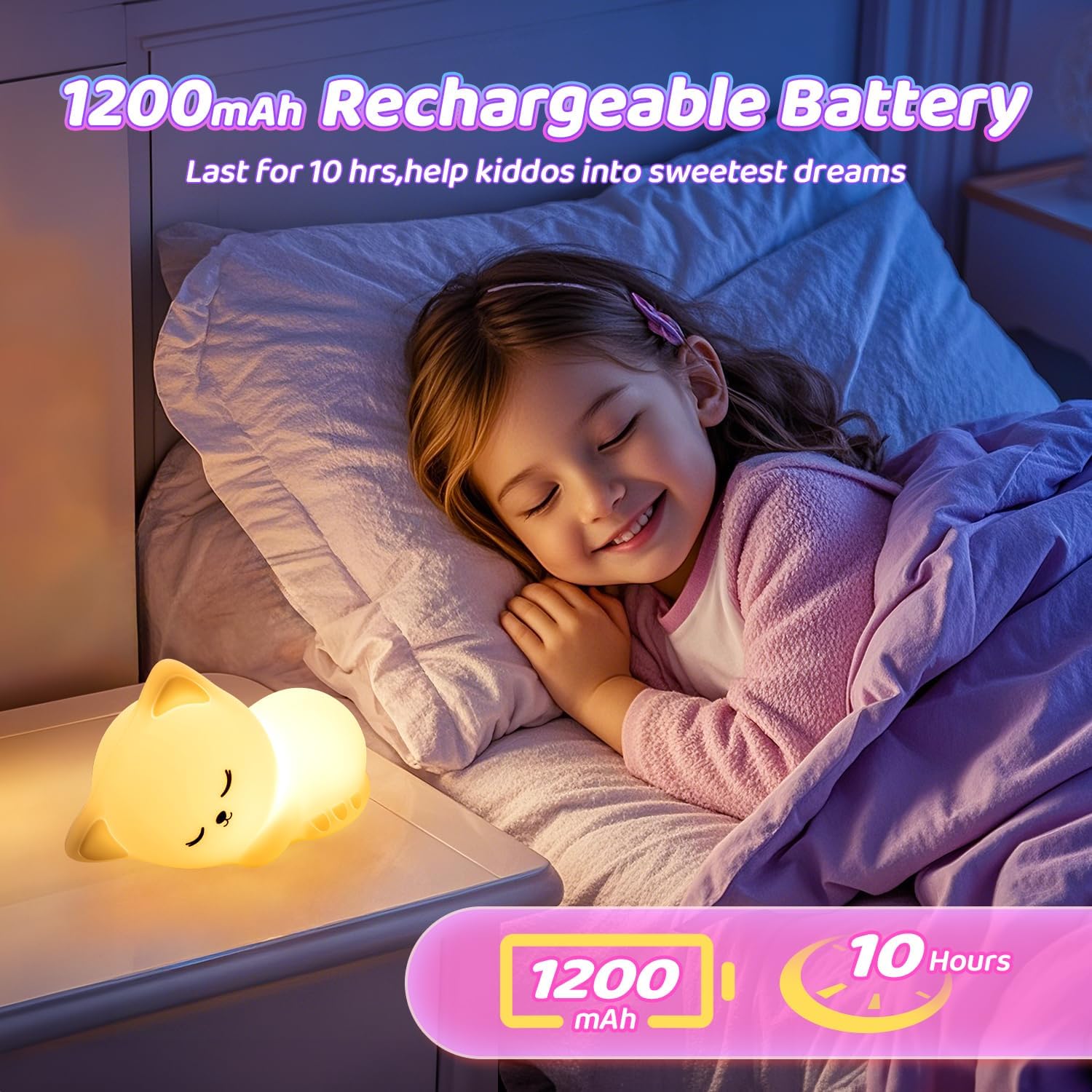 - 🎀【USB Rechargeble & Cordless & All-night Cuddling Kawaii Cat Lamp】The kawaii cat kids bedside lamps has a 1200mAh built-in battery. Once charged, the kawaii cat kids bedside lamps can work for about 8-12hrs WITHOUT CORD, accompanying kids all night.The animal night light cat lamp is PORTABLE & CORDLESS, perfect used as night lights for kids.Enjoy such a kawaii cat lamp. Kids are not afraid of the dark anymore! Just take the kawaii cute cats & cat gifts for cat lovers, kitten accessories home!