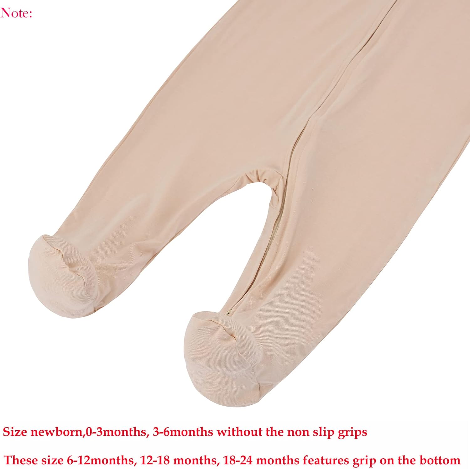 - Built in Mittens and Footed - Our baby footed pajamas all size with mitten cuffs, keep baby hand warm or prevent scratching. Footed style keeps your baby’s feet warm. These size 6-12m and 12-18m baby footie pjs features grip on the feet for extra stability. Great for little baby on the move(Newborn to 6 months size without non-slip grips)