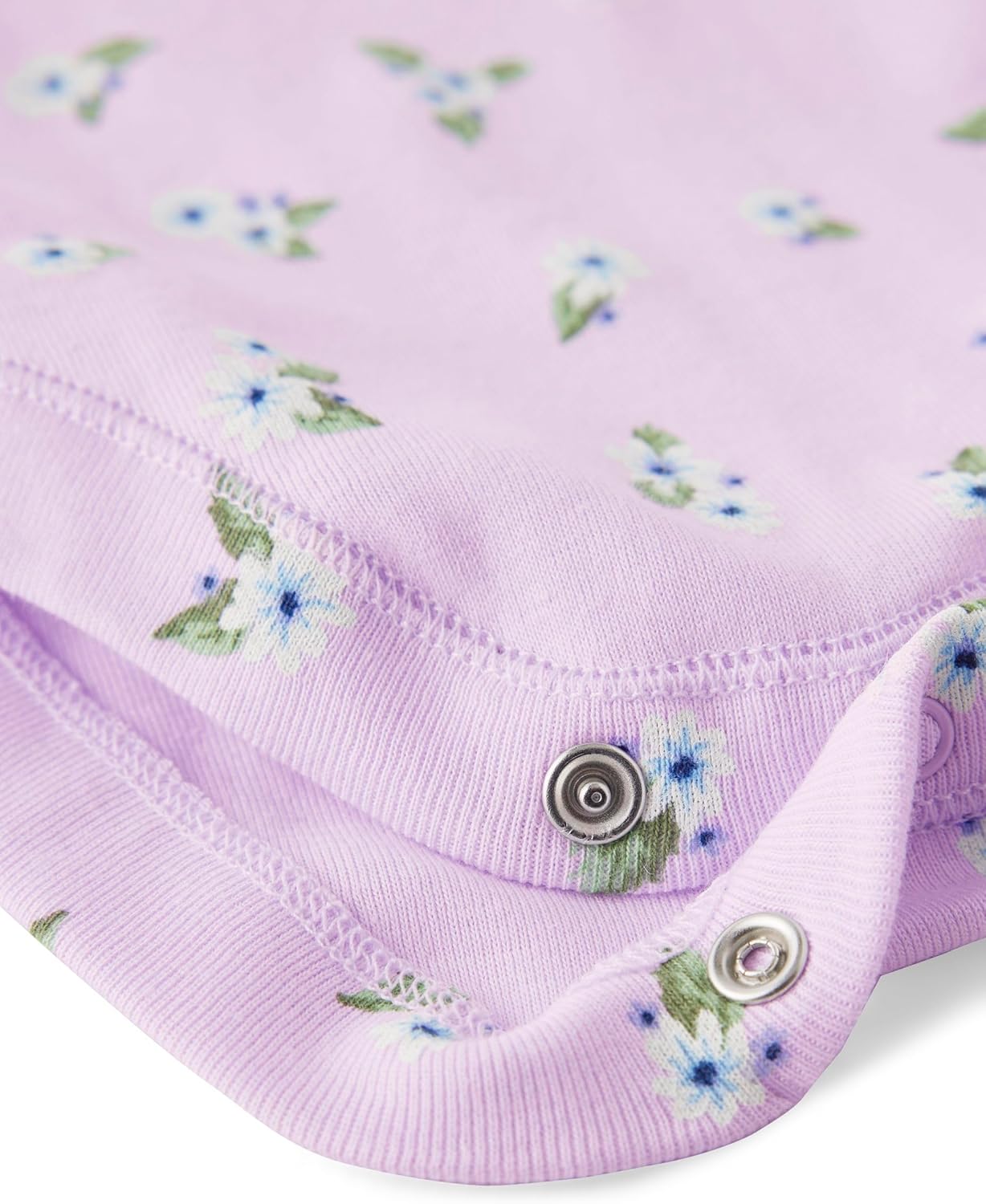 • MULTIPACK — includes 2 short sleeve bodysuits with allover floral print and ruffle neck, 1 short flutter sleeve solid bodysuit with flowers at neck