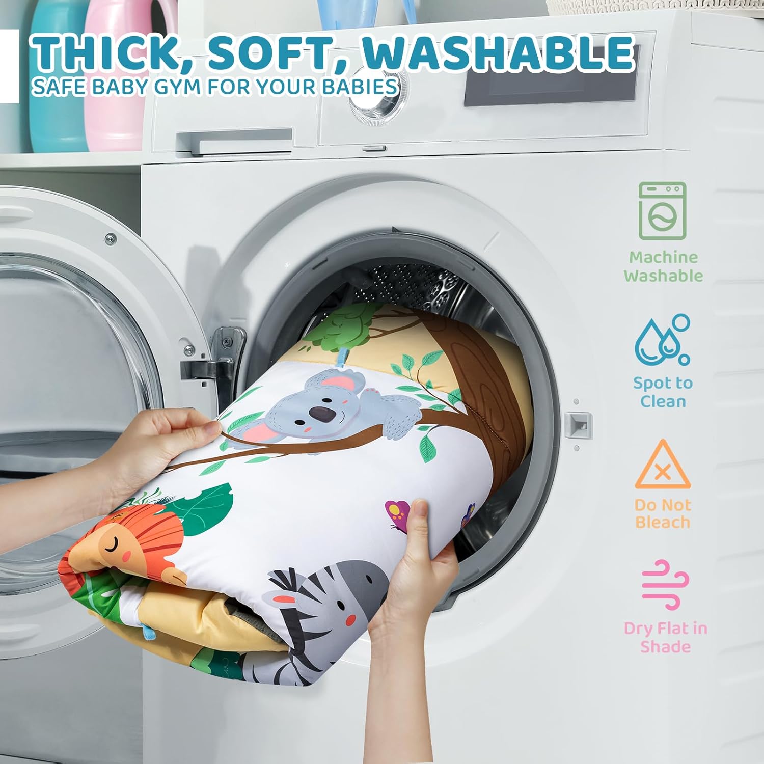 - Soft, Safe, and Washable - The baby gym play mat is made from high-quality fabrics, thick, delicate, and smooth touch, safe and comfortable for baby skins. Machine washable, easy to clean and keep hygienic. The tummy time activity mat can also be used directly on the floor, providing cushioning and protection for the baby. The balance of flatness and softness makes it more stable for babies to sit, stand and crawl.