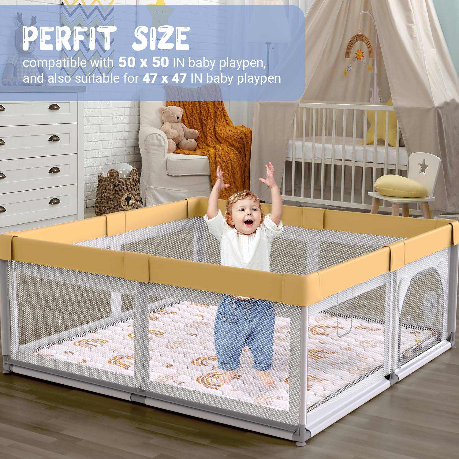 - 【Versatile Use】Baby play mats measure 50”x 50”and fit perfectly with popular brands like LIAMST, TODALE, YOBEST, Fanbufan and EIH 50 x 50 baby playpens. Or use baby playmat as area rug, baby crawling mat, kids tent mat, travel play mat, making them great for indoor and outdoor use.
