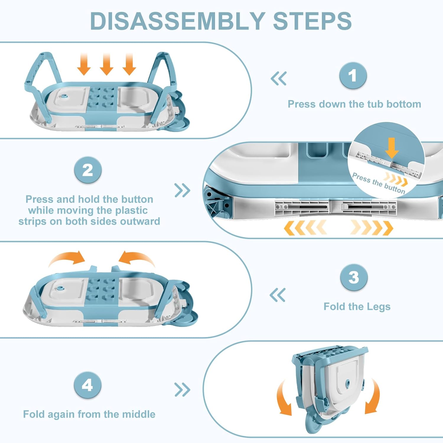 - 【Double-Fold Collapsible Design】Our upgraded baby bath tub can be effortlessly folded in just two steps to a thickness of under 4 inches. It even folds in half, enabling convenient storage in any corner, making it a space-saving solution.