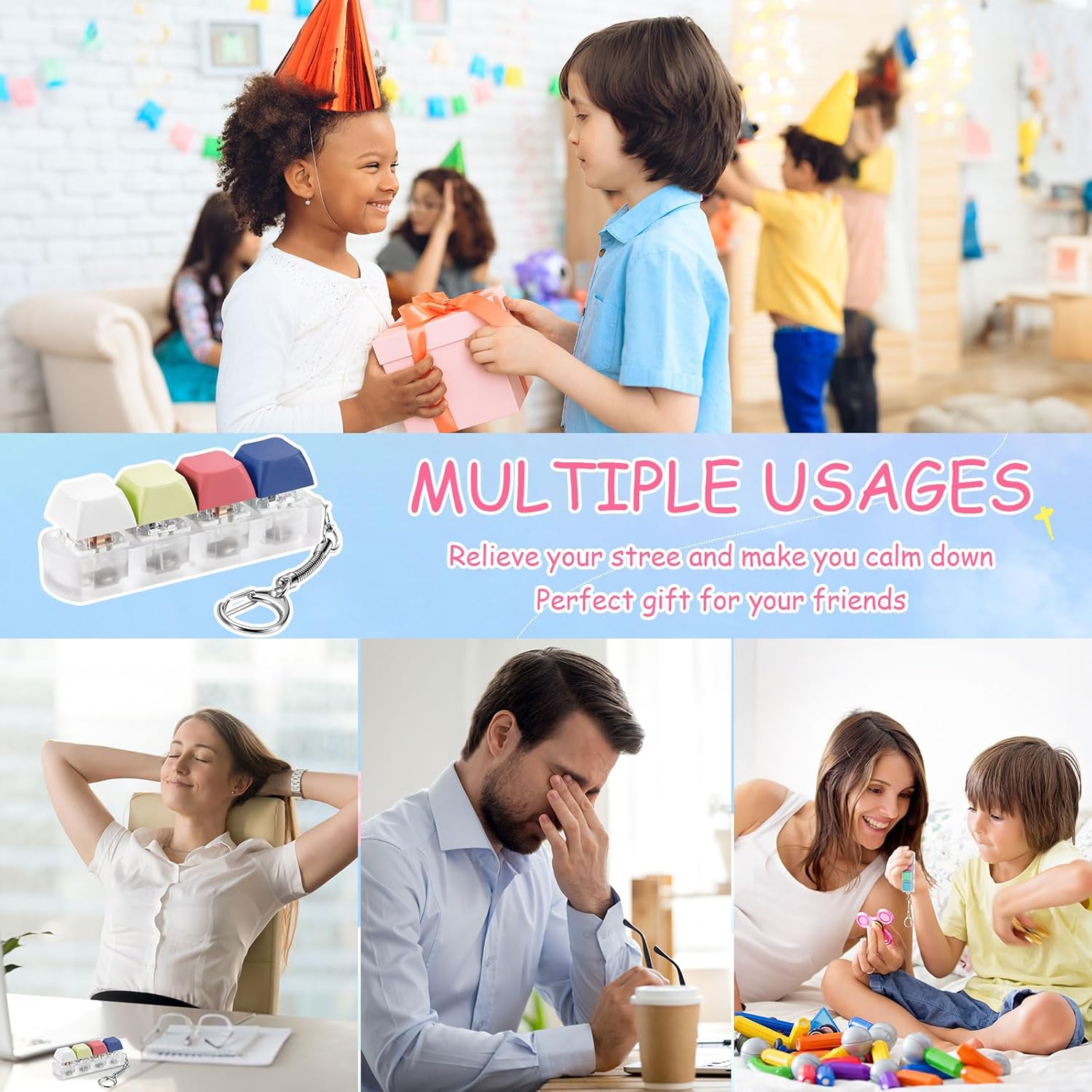 - Stress and Anxiety Relief: with every crisp clicking sound, the keyboard fidget clicker helps in calming your mind and relieving stress and anxiety; The satisfying click sound and the rhythmic pressing action make the toy ideal for maintaining focus and improving concentration