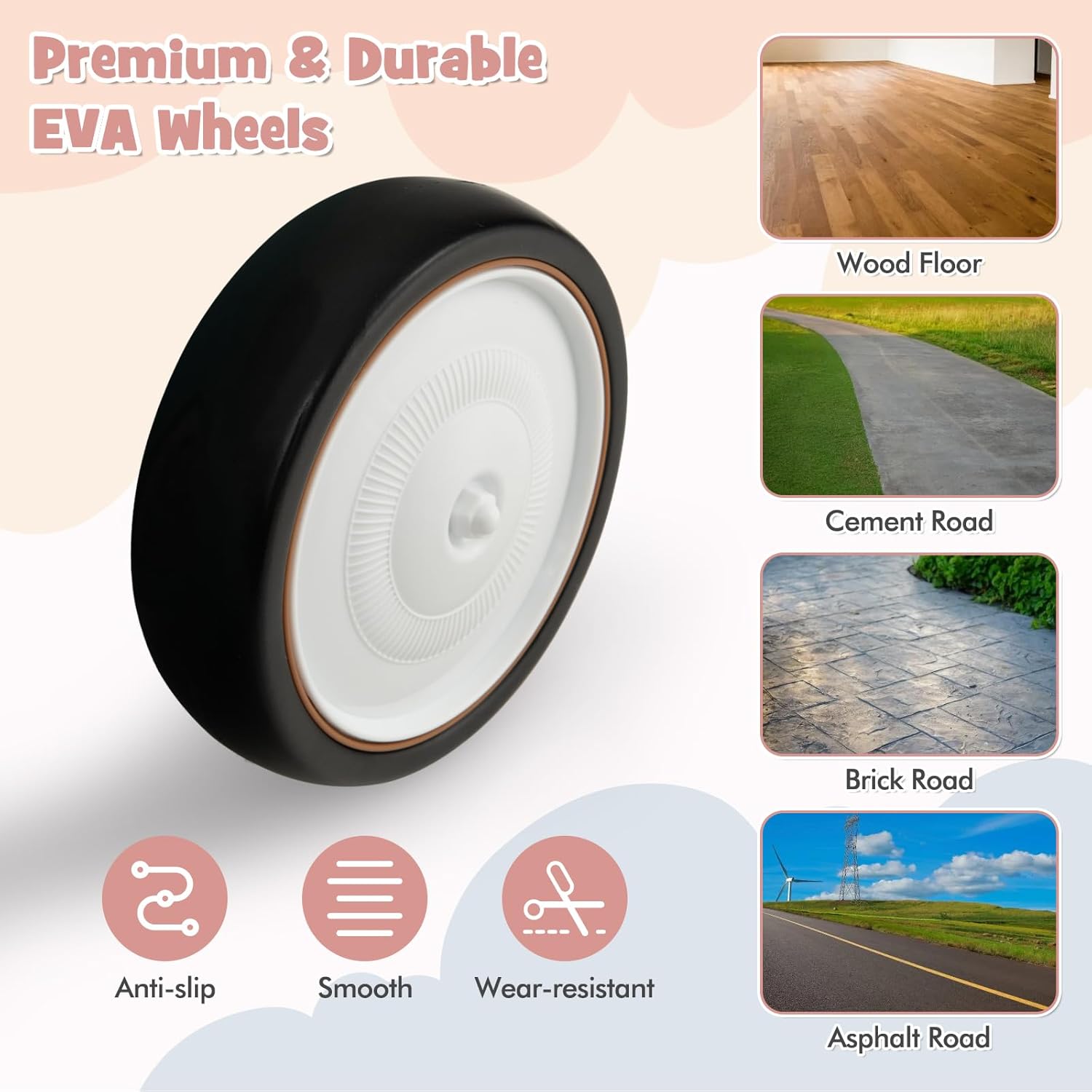 - 【Premium & Durable Wheels】Equipped with 4 all-terrain EVA wheels, the baby push walker offer superior performance. The wheels are anti-slip, wear-resistant, and shock-absorbent, ensuring smooth and safe rides on different types of surfaces such as wood floor, cement road, brick road and asphalt road.