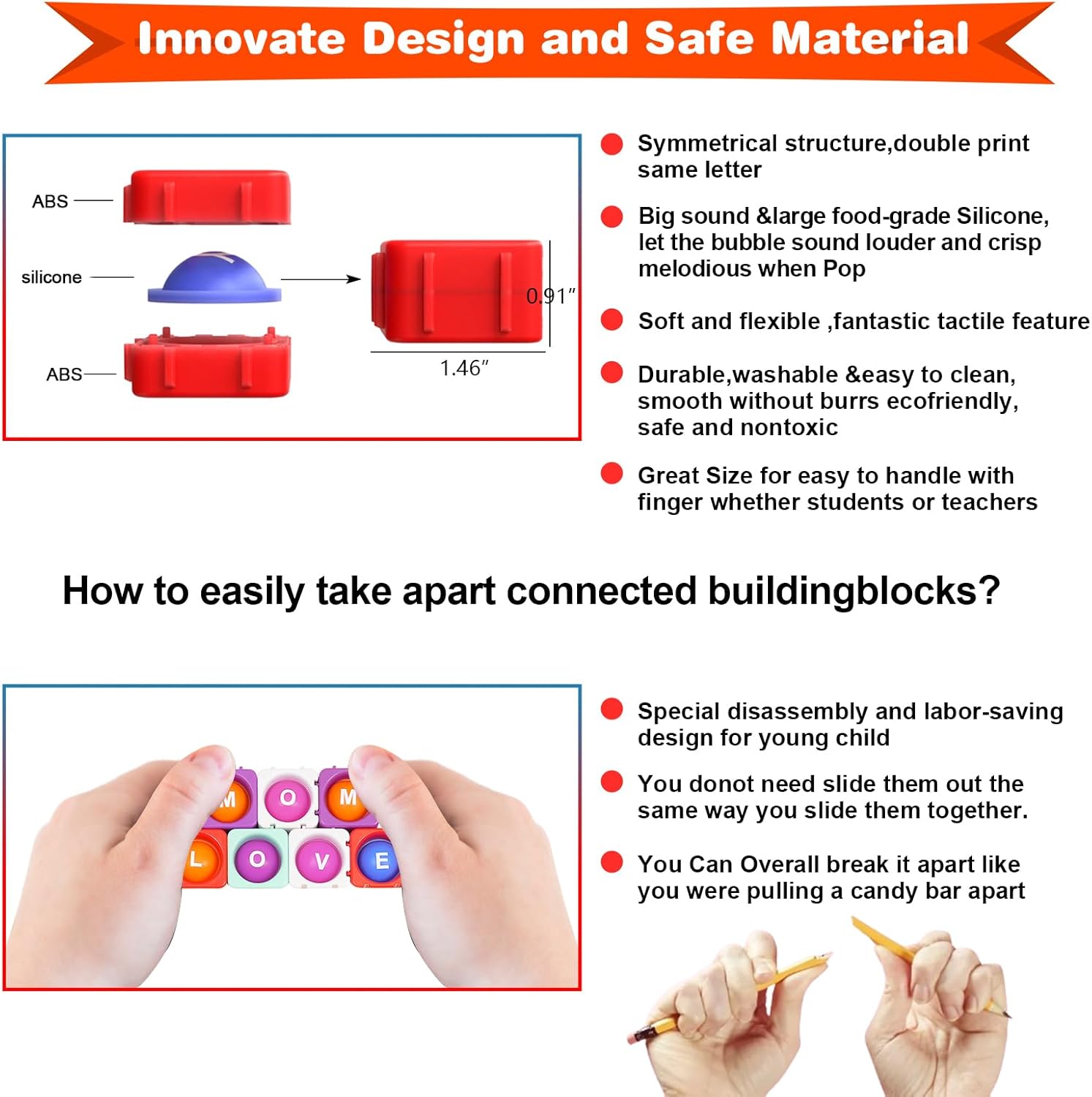 - 1️⃣👍 【Funny& Engaging Sensory Toys】We are the inventor of discrete pop letter building block, Because letters have a direction, it cannot be produced industrially and requires a lot of manpower, but we overcame the difficulties and achieved it to give kids great learning tool. The letter blocks are colorful and attractive, be stackable, which can help children develop their imagination and creativity, and can also be used to build different structures. The blocks are designed with a pop-up mechanism