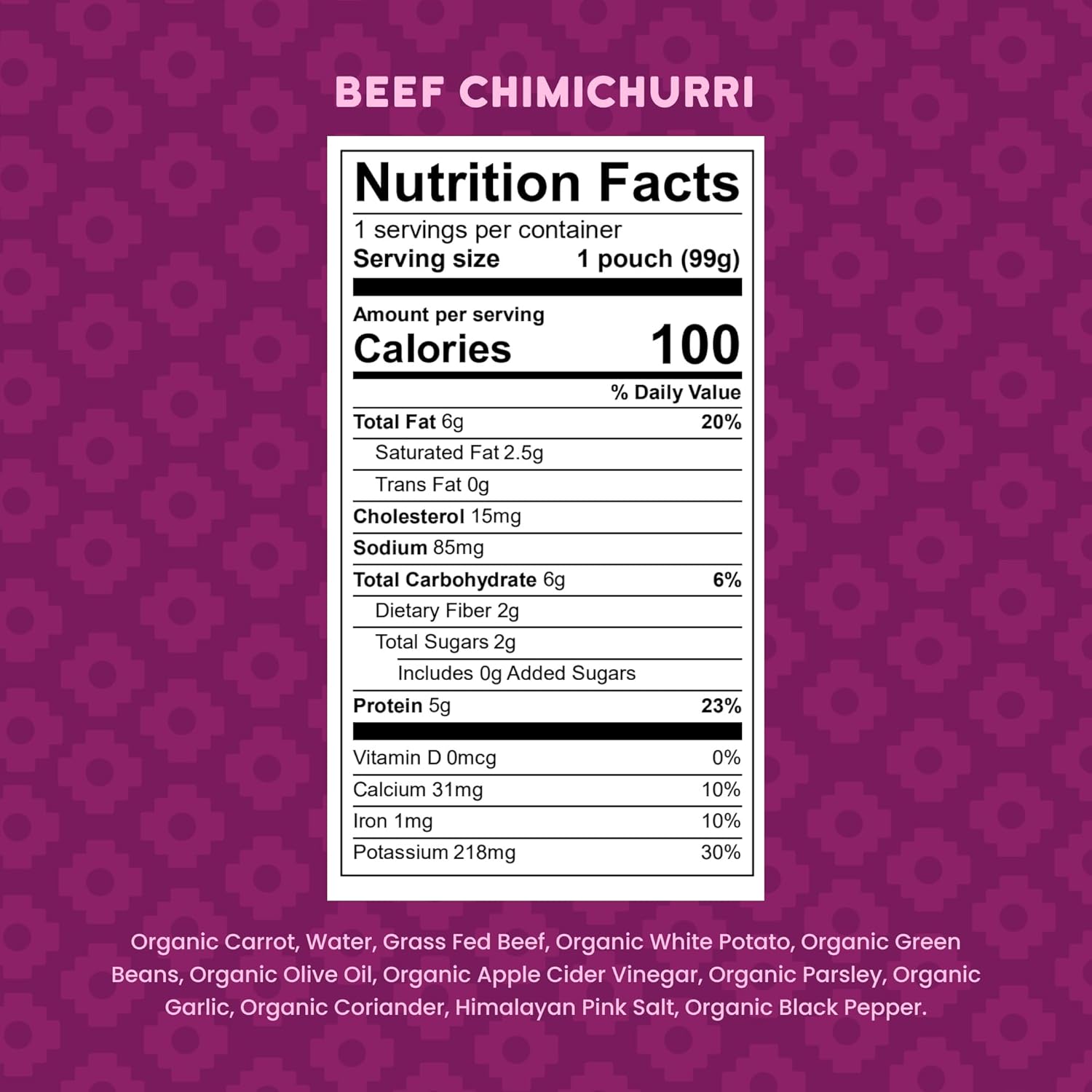 - FLAVOR ADVENTURE: Let your little foodie explore with our beef chimichurri baby puree pouches! These 3.5-ounce BPA-free baby pouches make feeding on the go a breeze with tasty beef chimichurri flavor