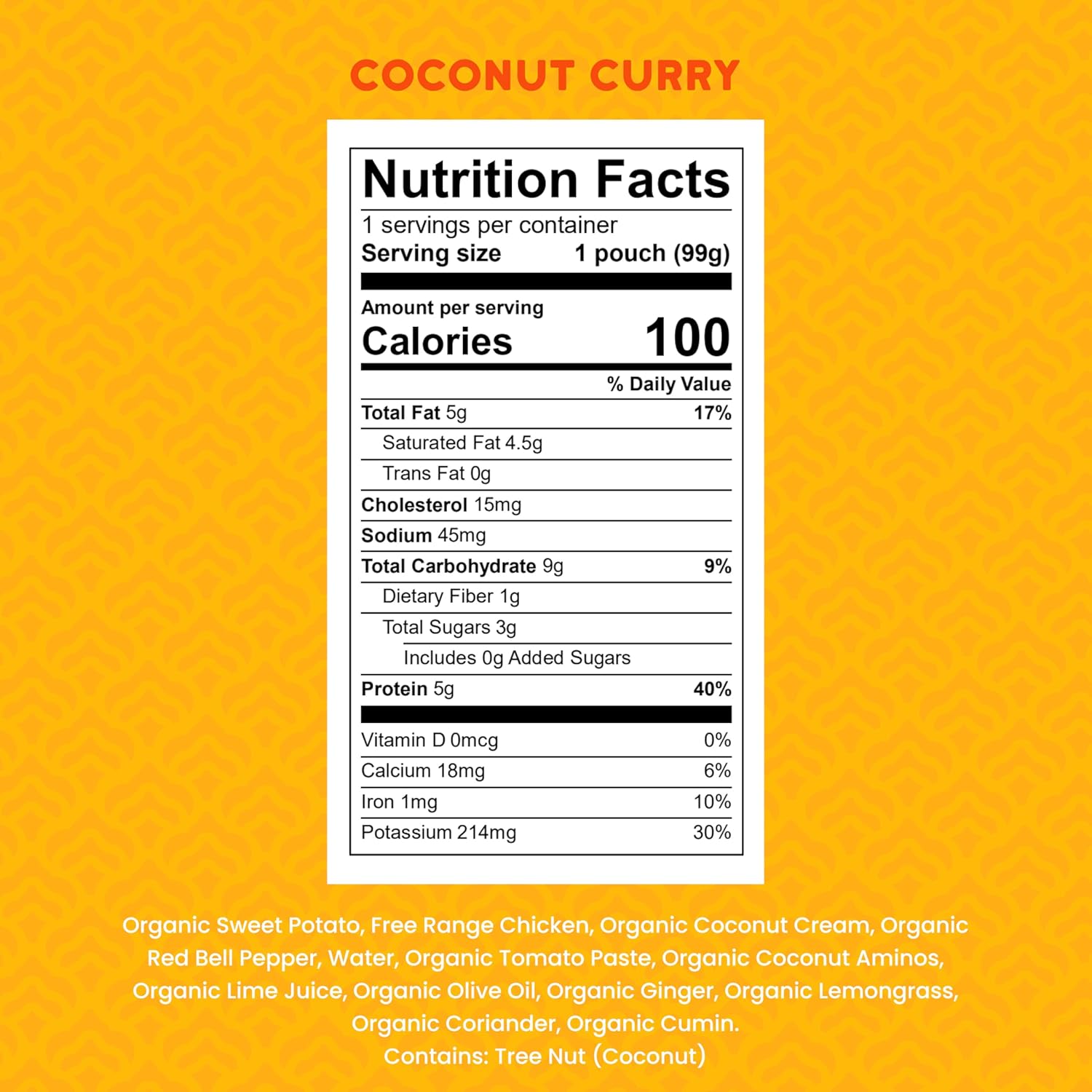 - SAVORY BLENDS: Packed with protein and healthy fats, our coconut curry chicken baby food is more than just sweet. It's a tasty way to introduce baby friendly curry flavors, turning mealtime into a fun adventure