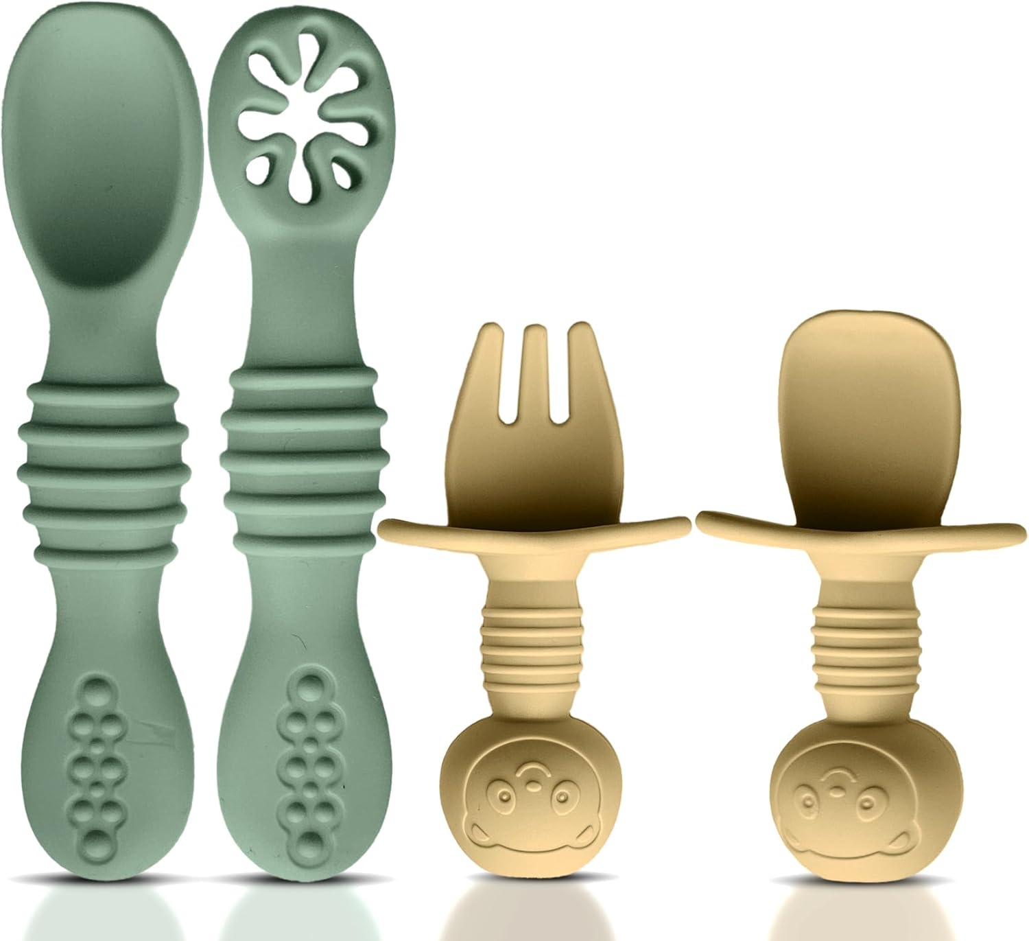 - COMPLETE BABY EATING UTENSILS: HippoBaby 4 Piece baby led weaning spoon and fork set is a great way to encourage your baby to develop healthy eating habits and to promote independence. This kids utensil set is made out of high-quality silicone material and is designed to last for years. The baby feeding utensils set comes with 1 pre-stage infant feeding spoon and 1 baby fork, 1 Stage-1 and Stage-2 spoons. The set is designed to promote independent eating and is ideal for babies who are starting to explore different textures and flavors.
