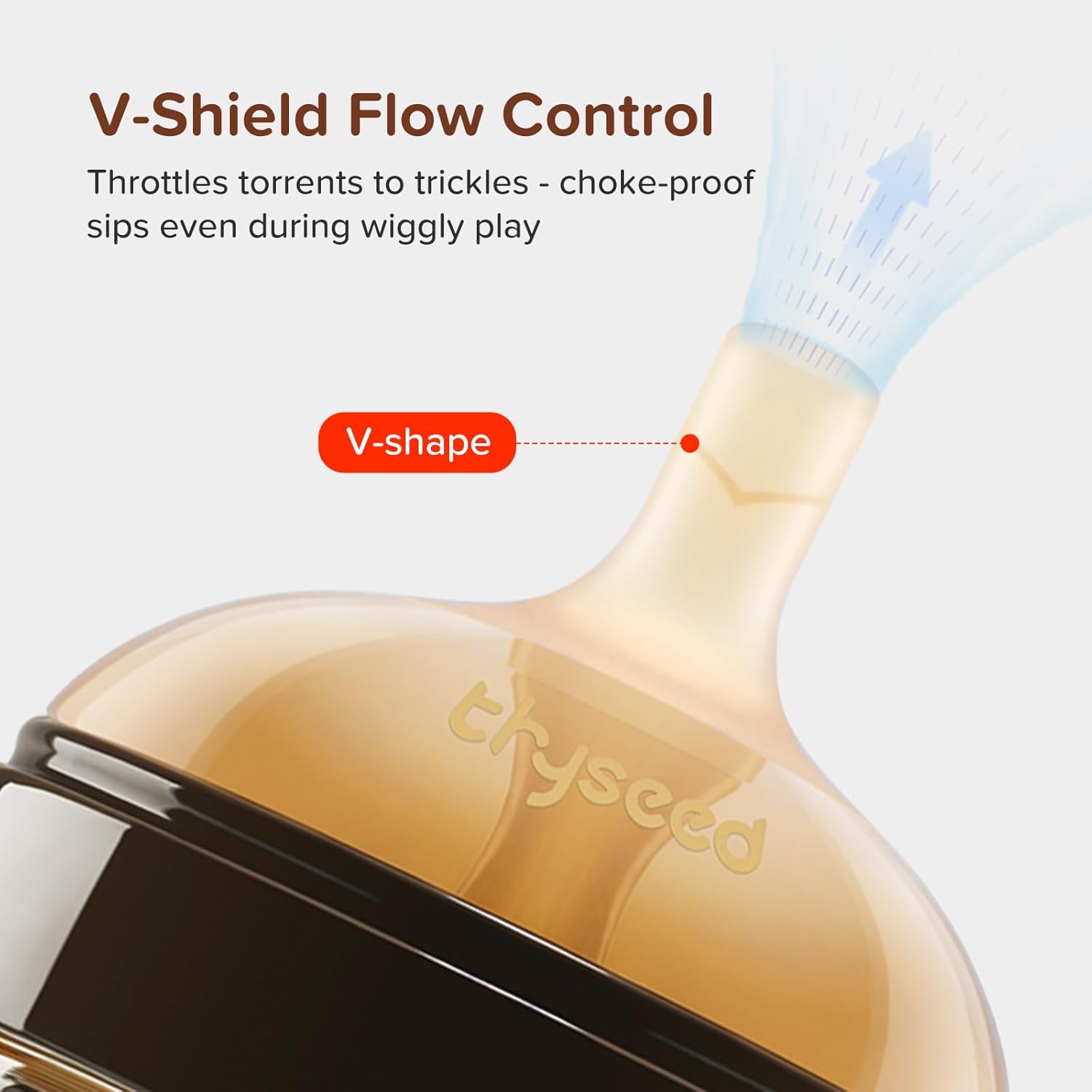 - V-VALVE DESIGN: Automatic opening, easy sip, effortless flow. Size varies with suction, self-adjustable flow, smooth sips, choke-free trips. No spray, no leak! Learning to drink should be fun, not messy. Spill-proof soft spout is gentle on teeth and gums.